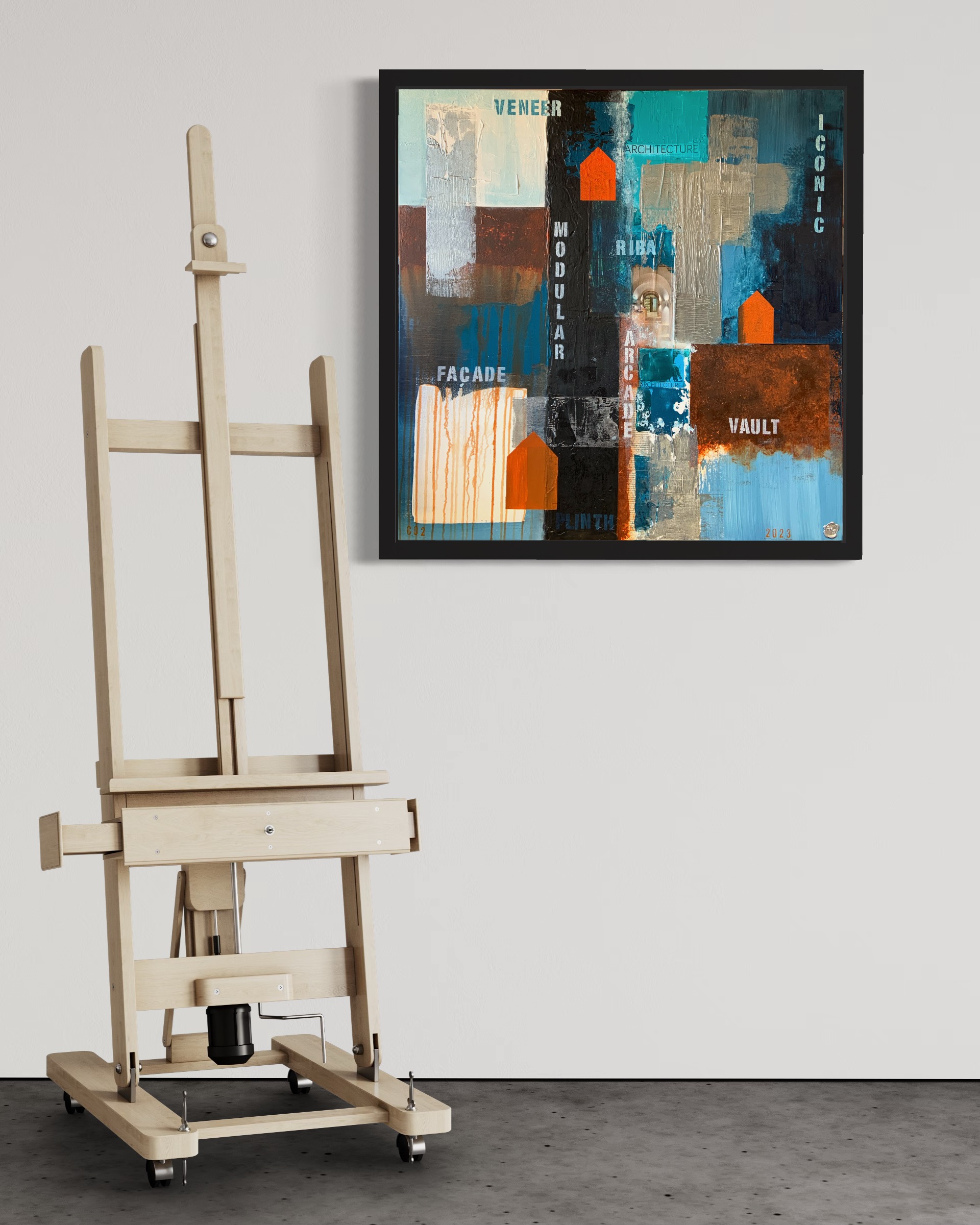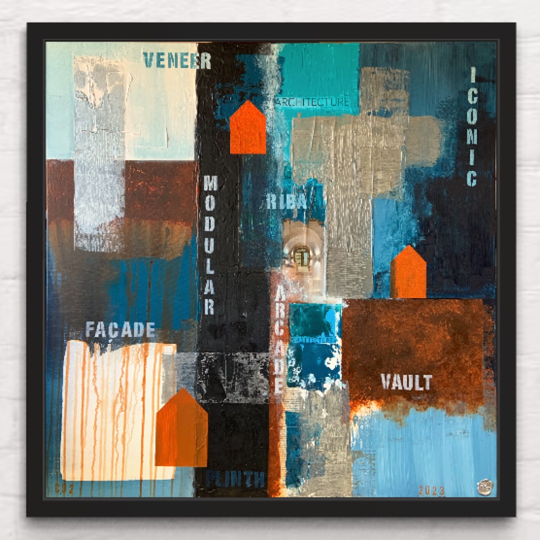 This artwork bursts with architectural language, layered textures, and bold structural compositions, creating a dynamic dialogue between text, form, and colour.
