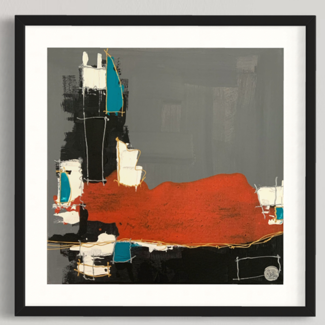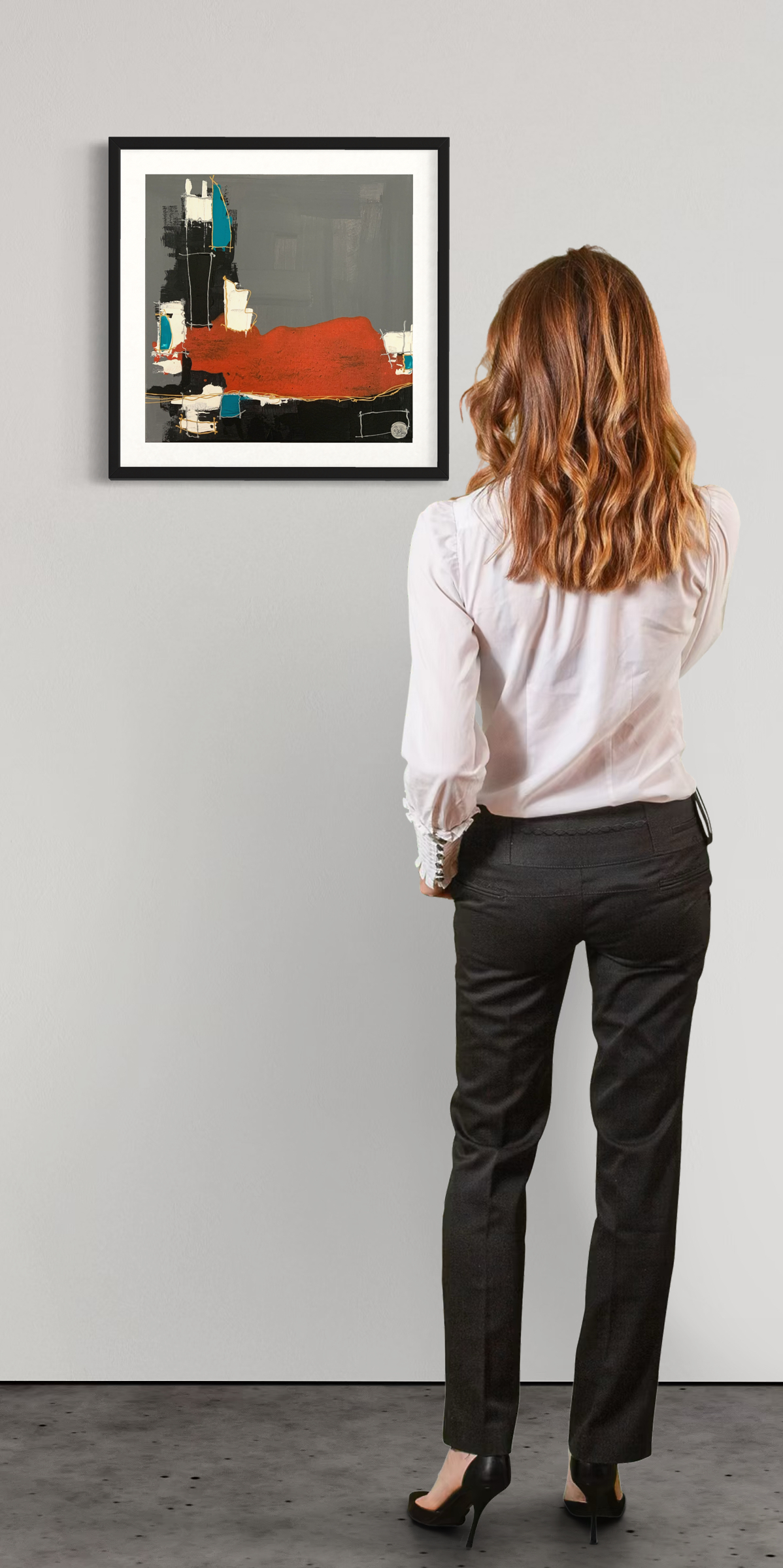 A dynamic play of bold red against grey and turquoise, creating a striking urban landscape