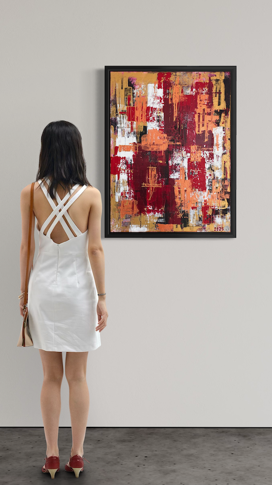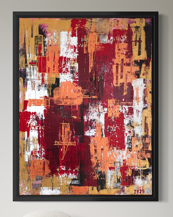This is a vibrant abstract painting that captures energy, emotion, and intensity through bold colour and texture. Deep reds and warm oranges dominate the composition, contrasted by areas of white and touches of gold, creating a sense of heat and movement across the canvas.