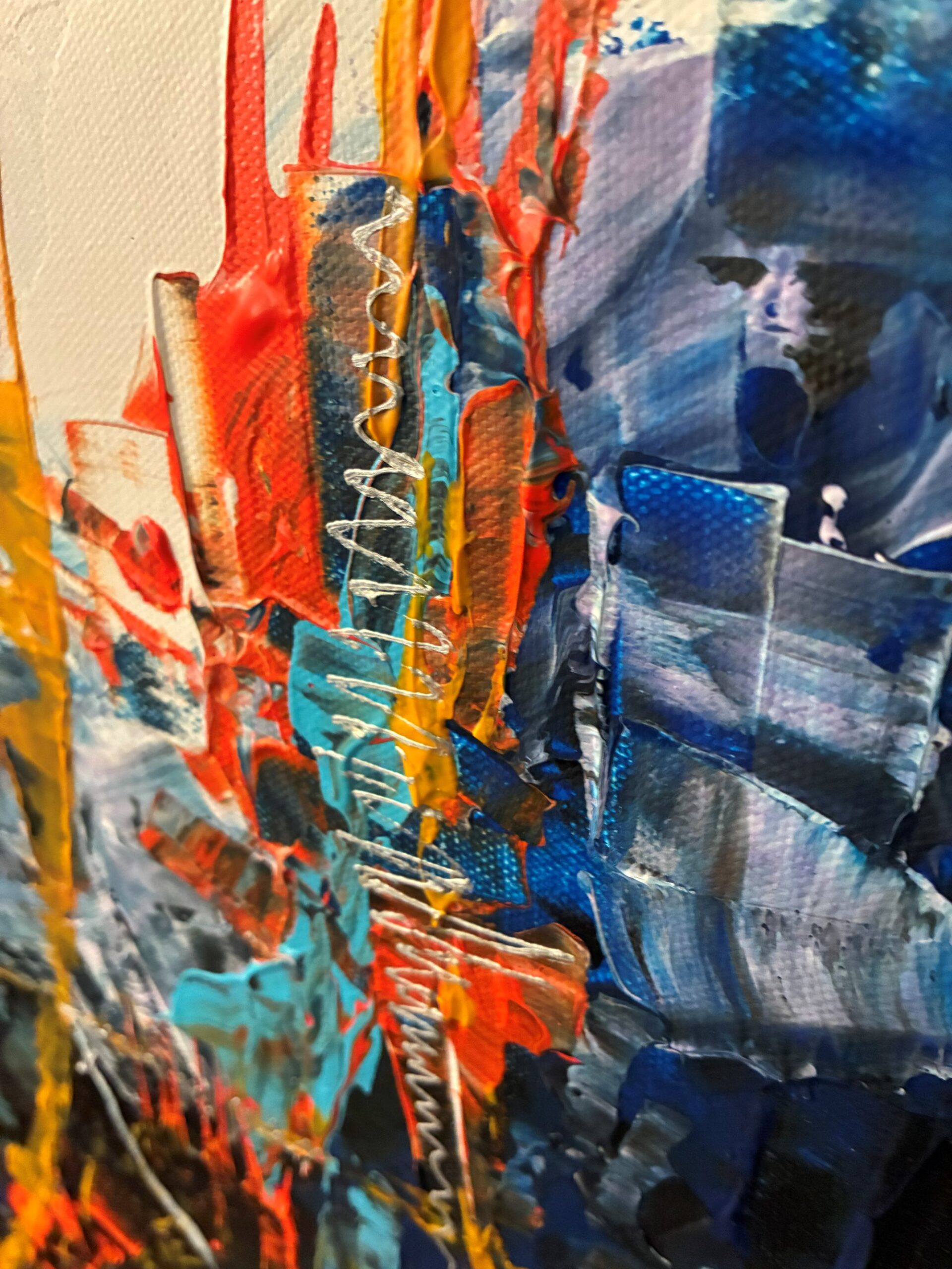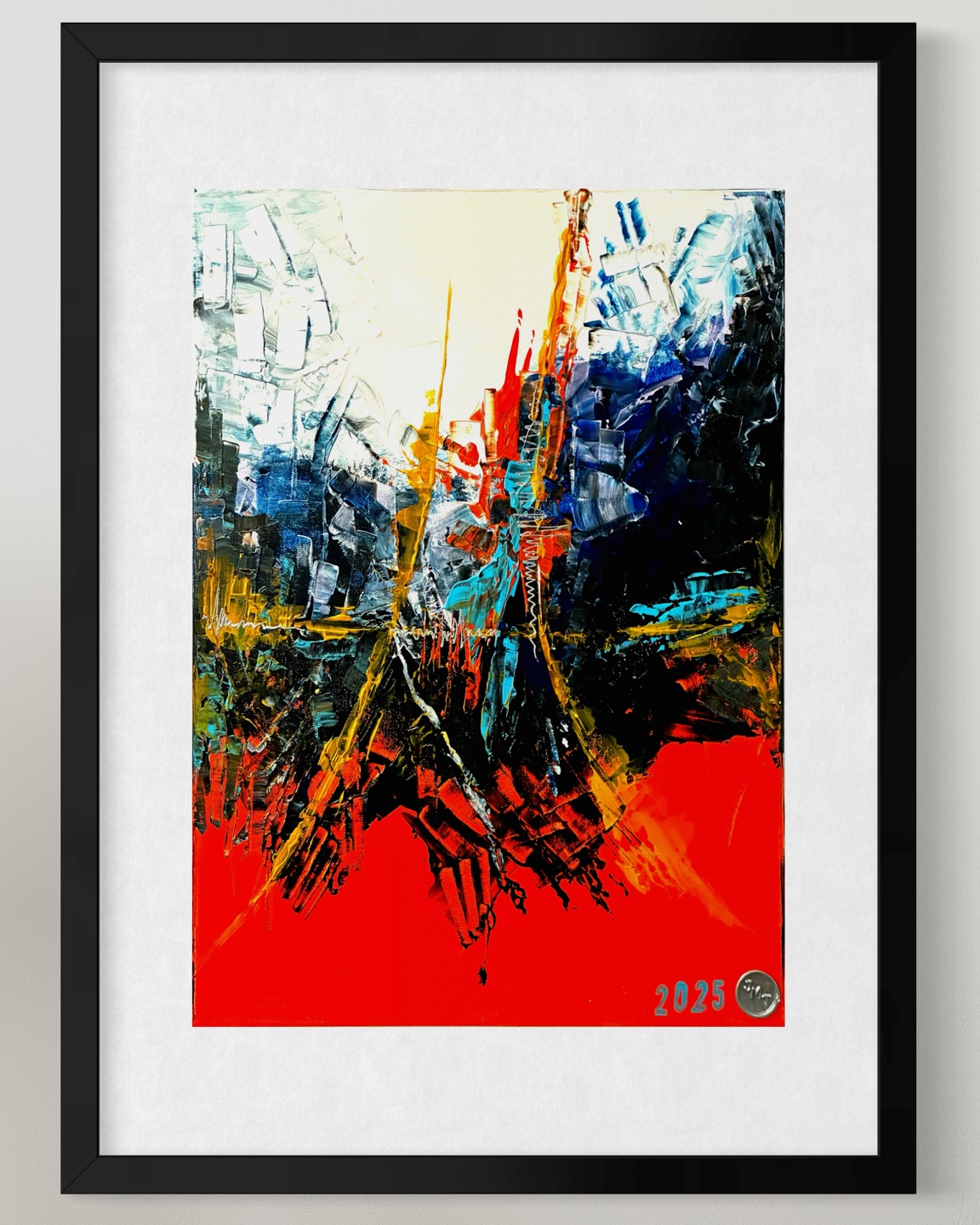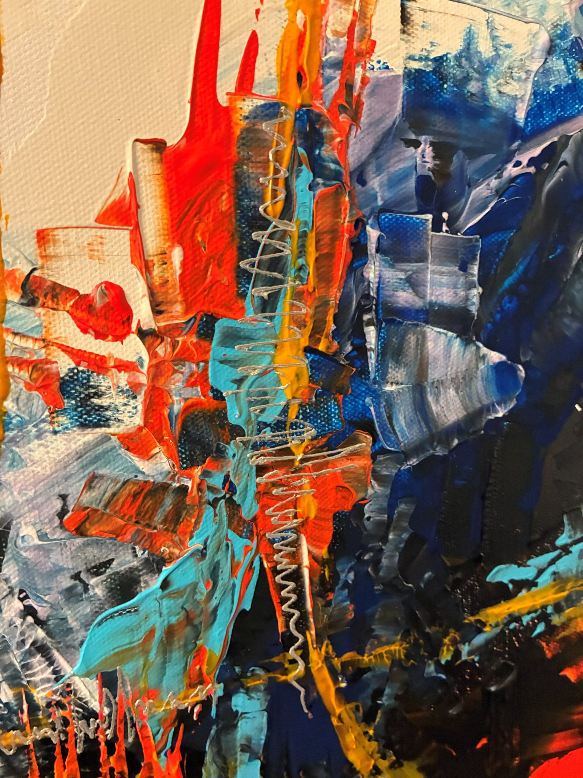 This dynamic abstract painting radiates energy, contrast, and motion. The