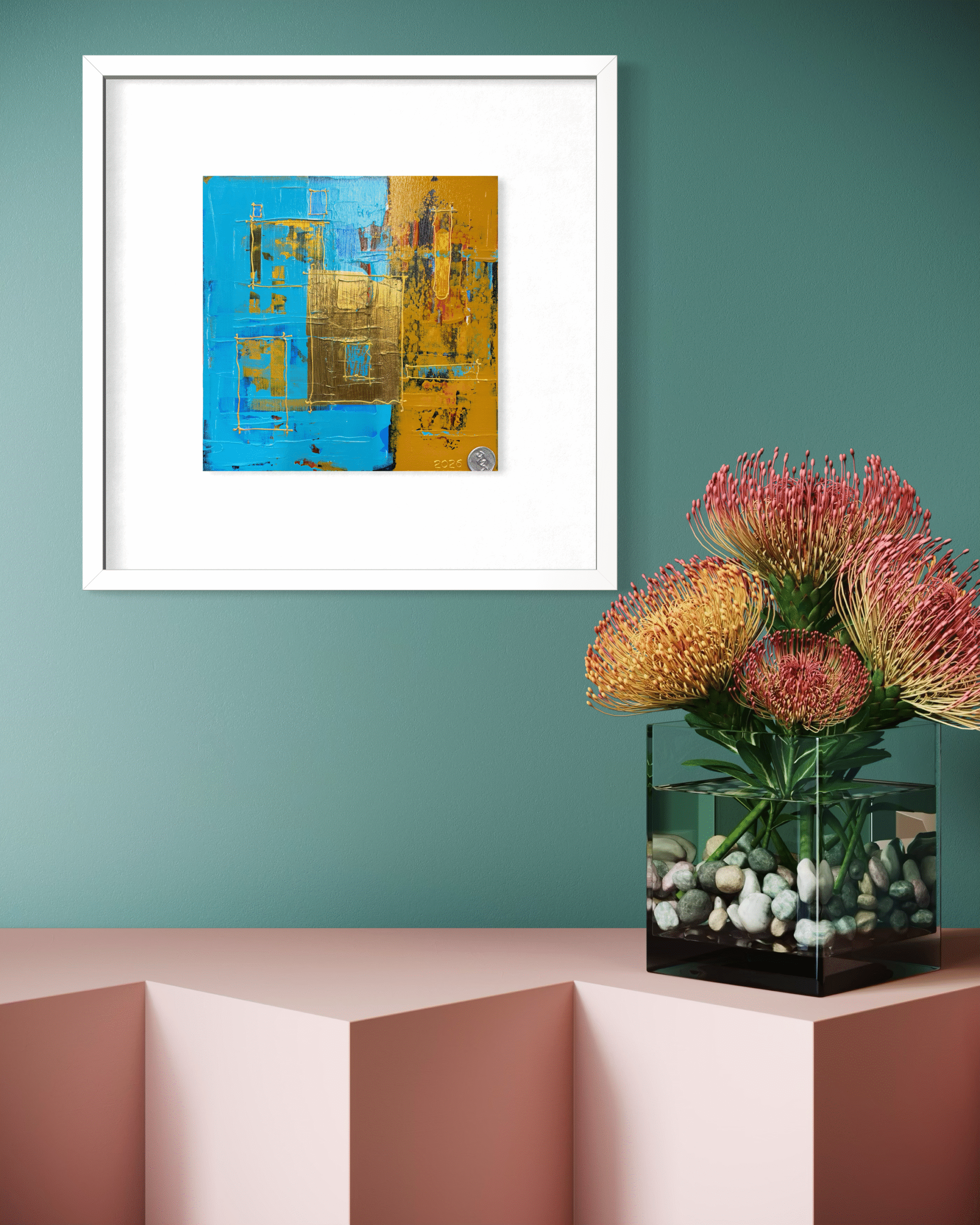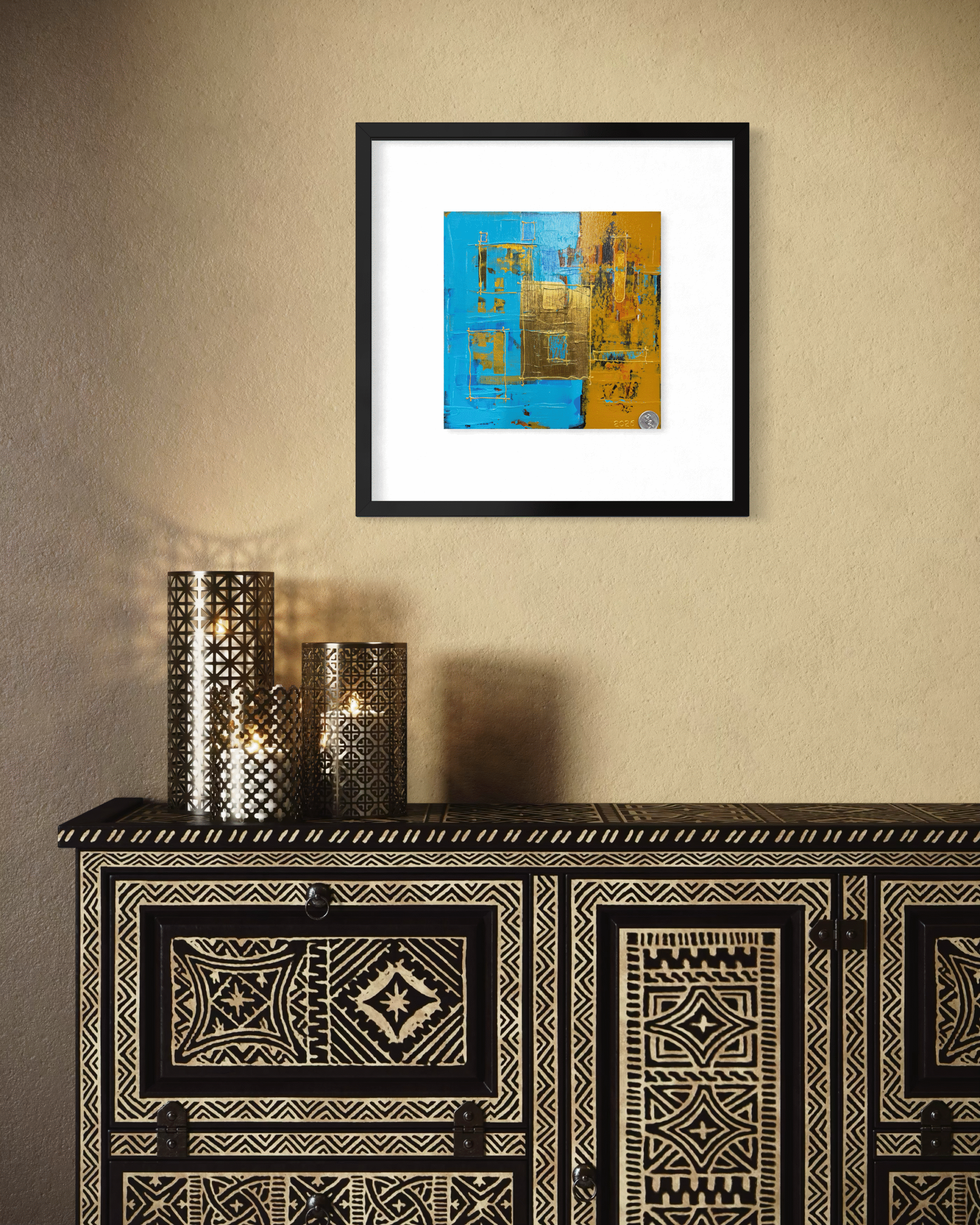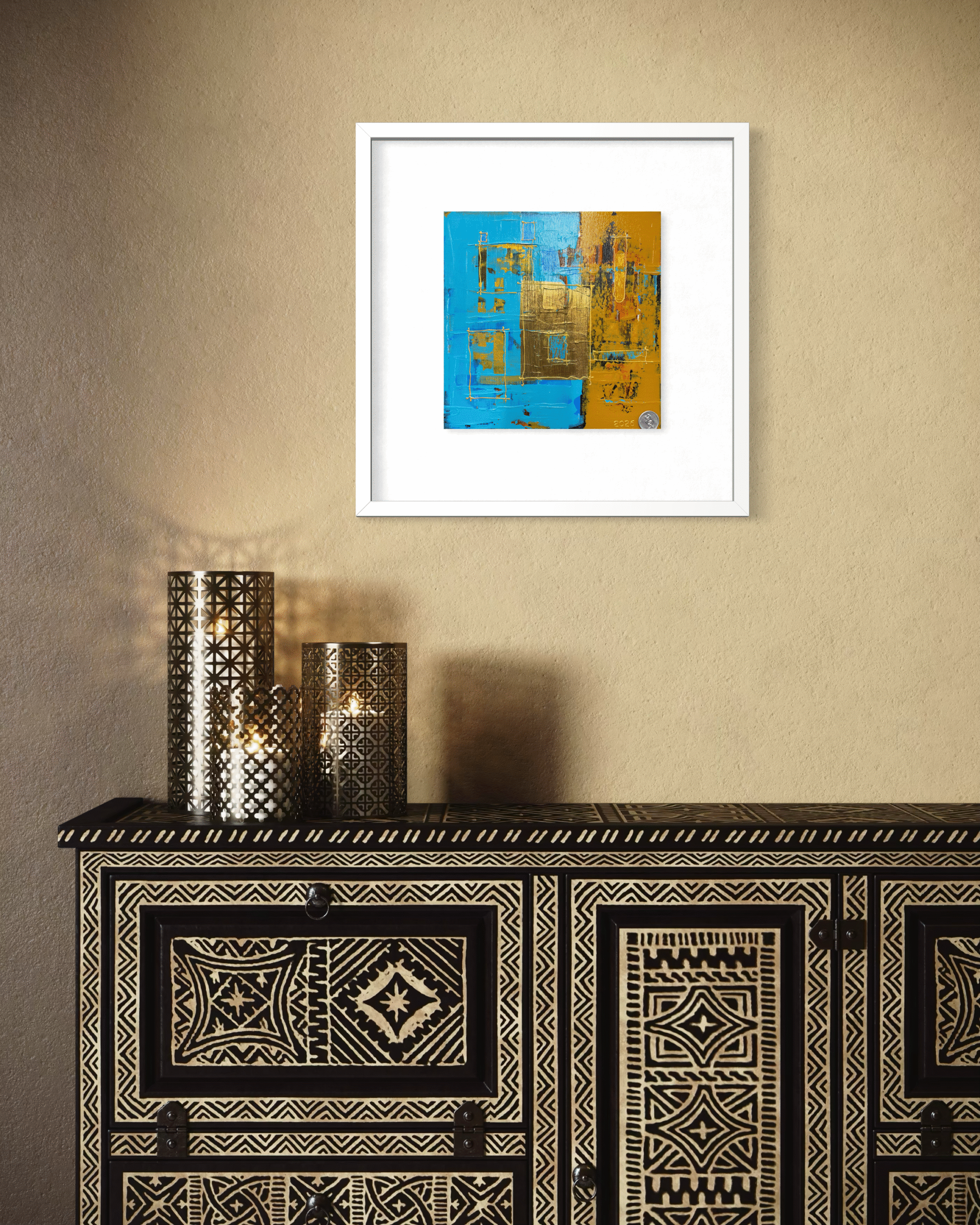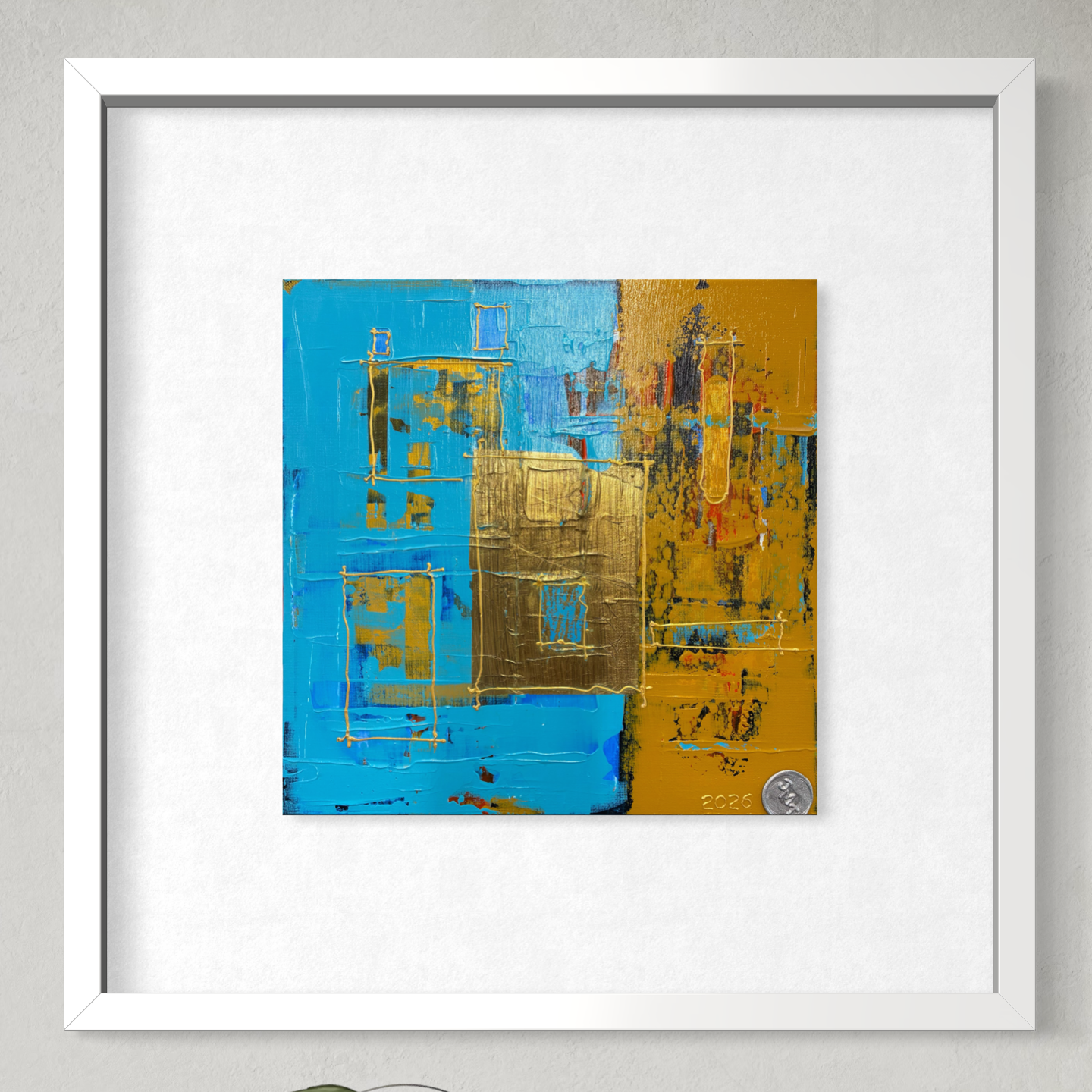 At the centre sits a textured metallic gold square, slightly overlapping the colour boundary. This element becomes the visual anchor of the piece. Its heavy, sculptural surface contrasts with the flatter painted areas and suggests solidity—like a doorway, window, or central chamber.