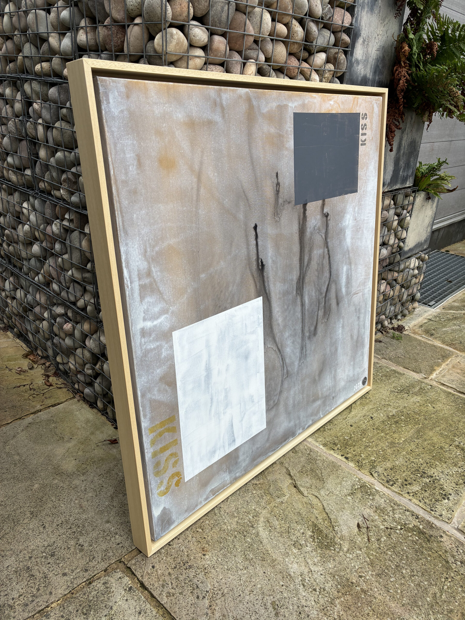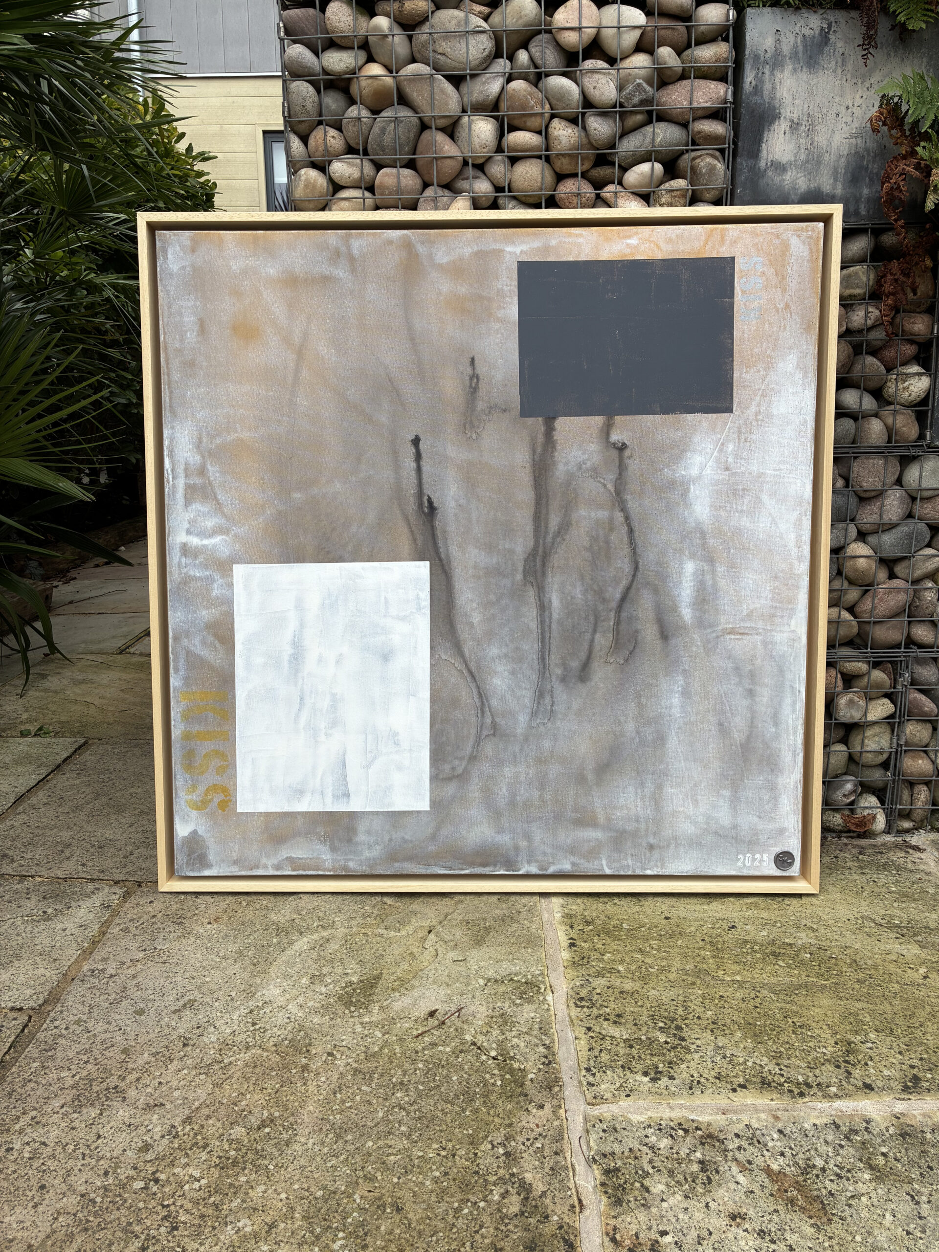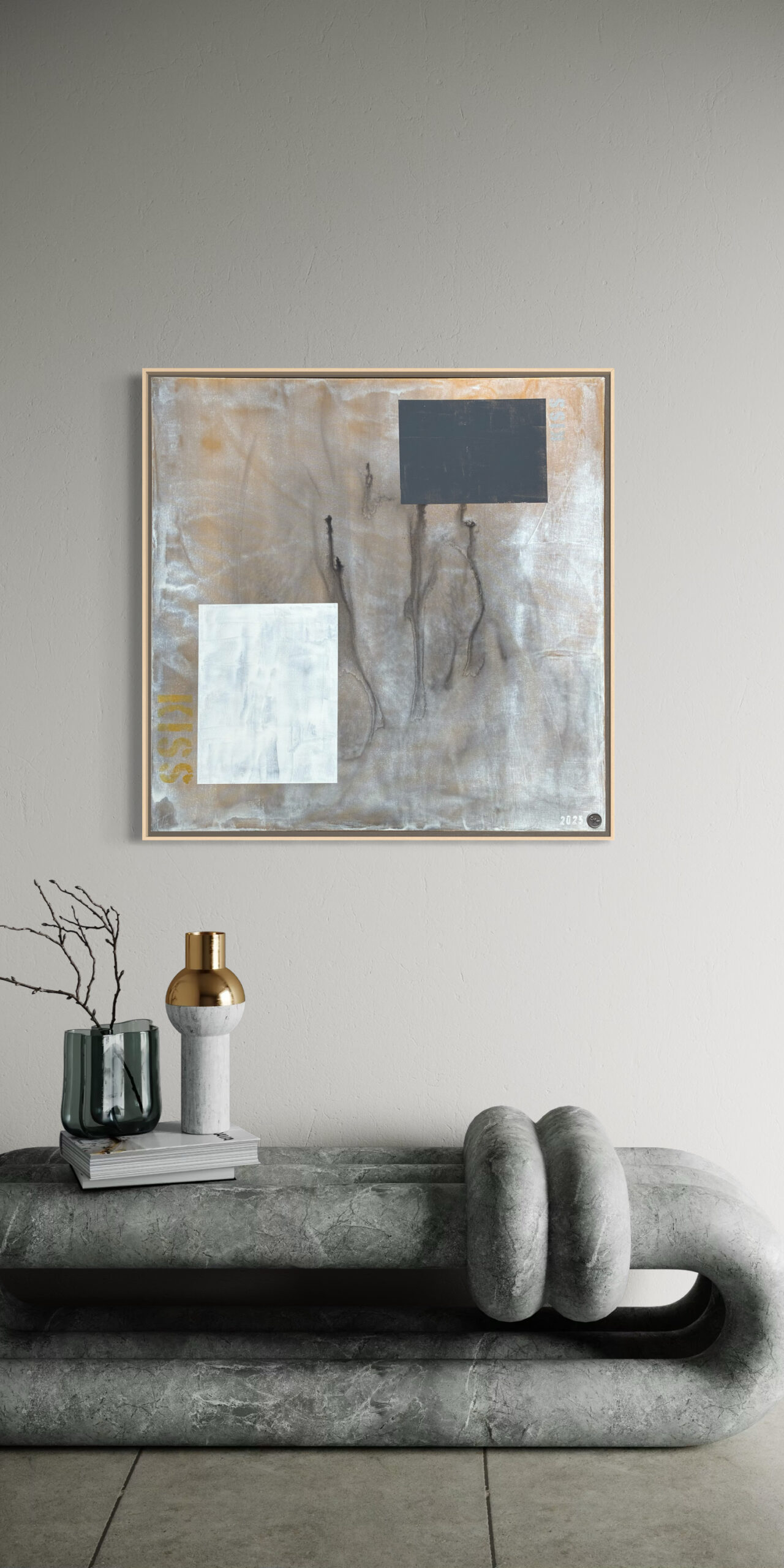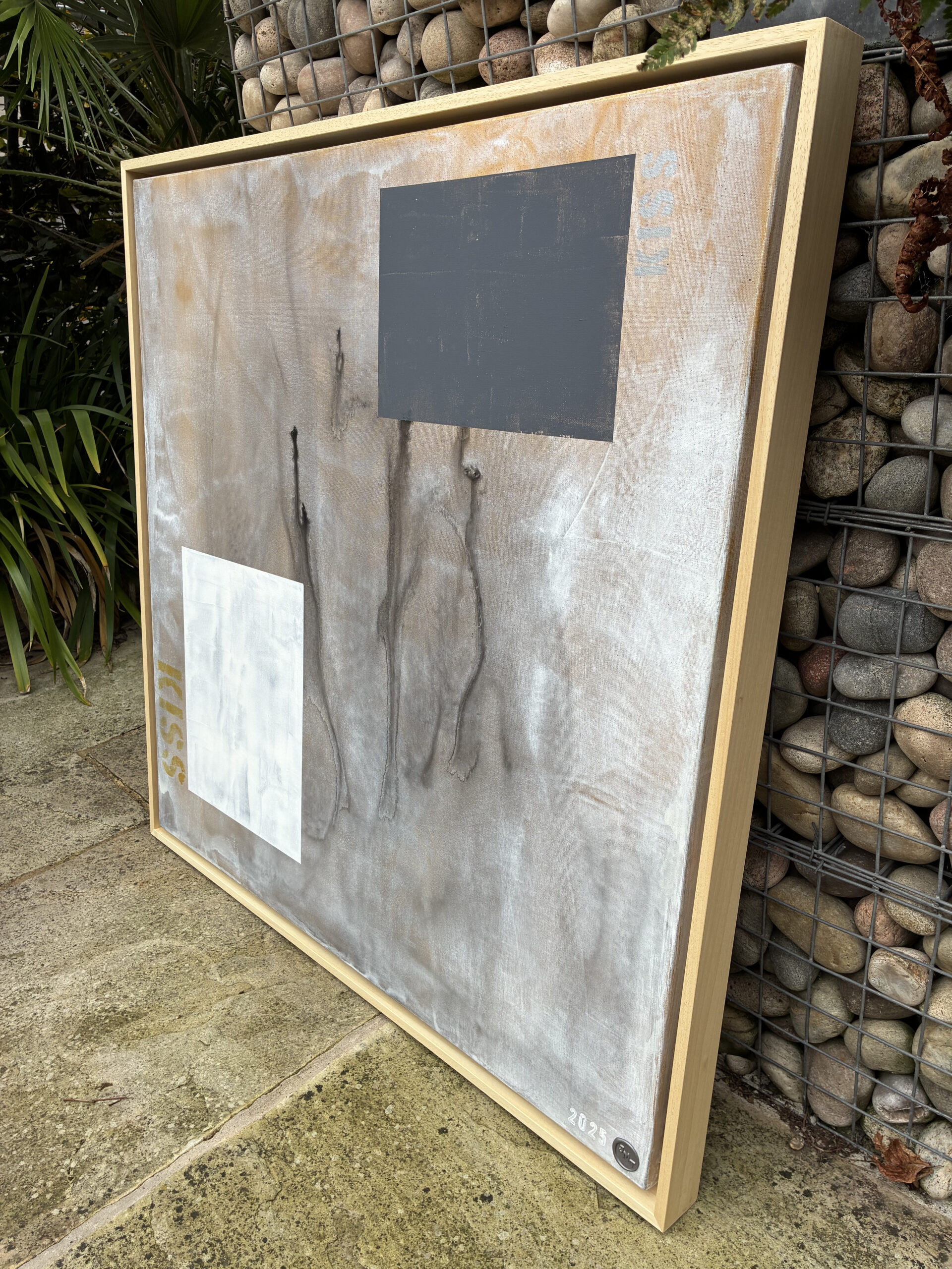 This abstract artwork is a striking study in contrast, geometry, and texture, blending earthy depth with vibrant precision.