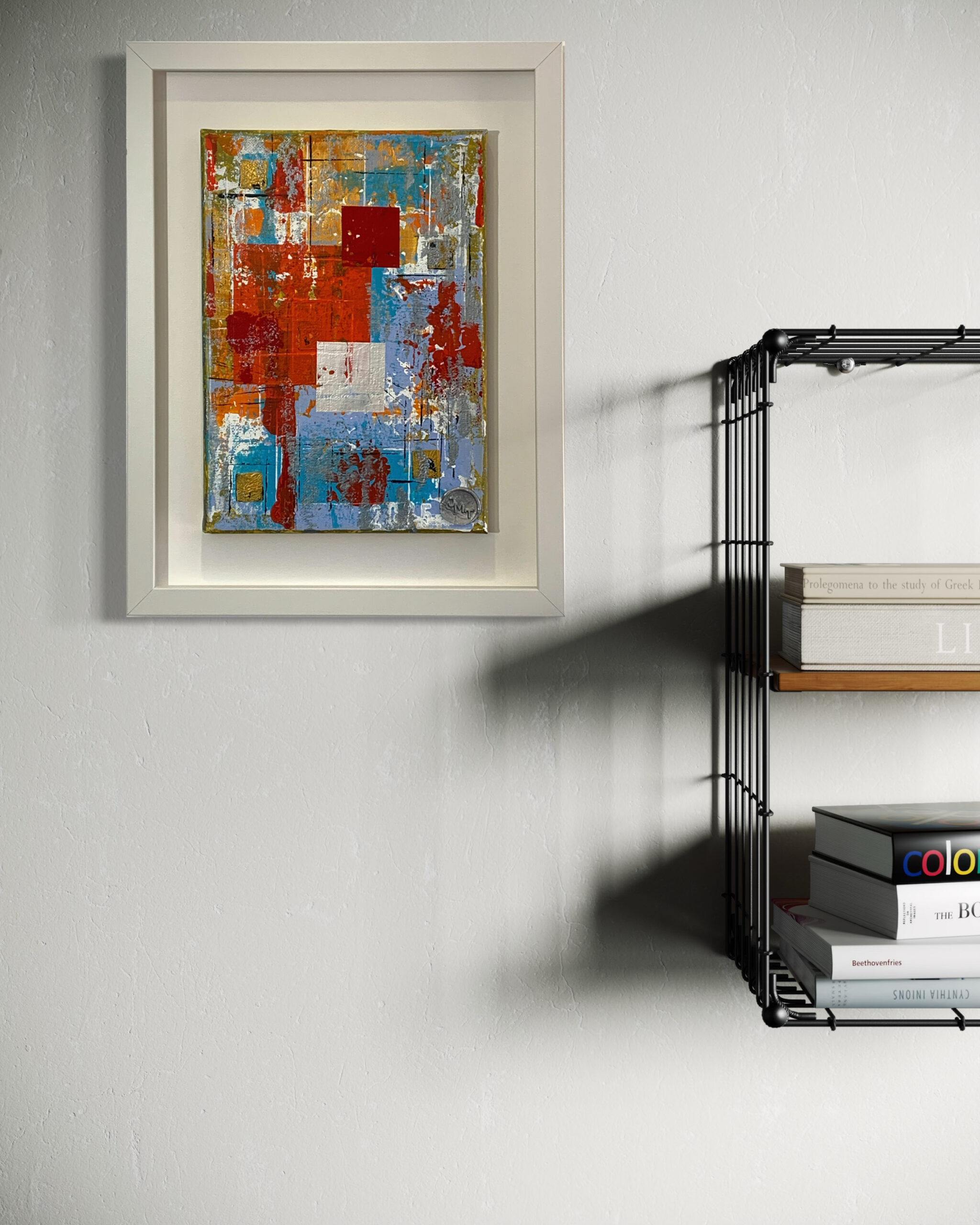 A vibrant interplay of geometric patterns and bold colours creates a dynamic abstract composition.