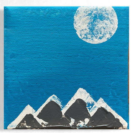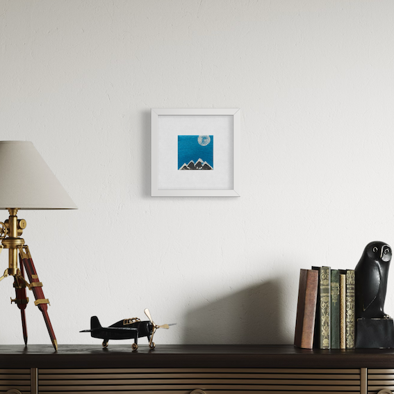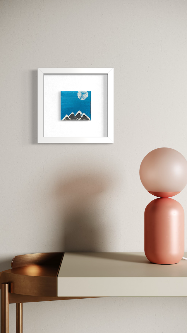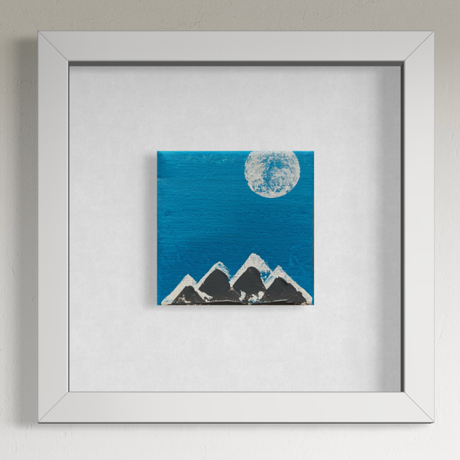 The moon illuminates jagged peaks under a deep blue sky, evoking serenity.