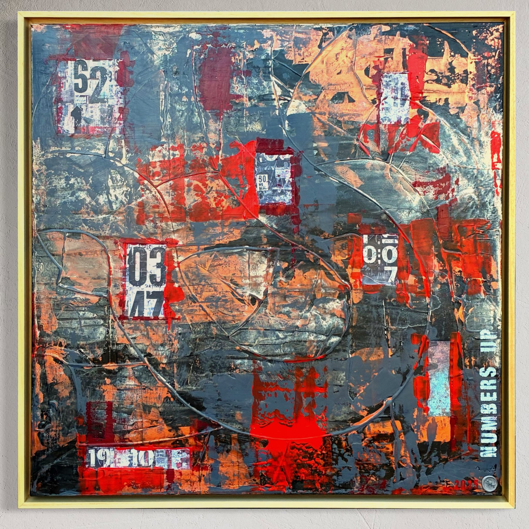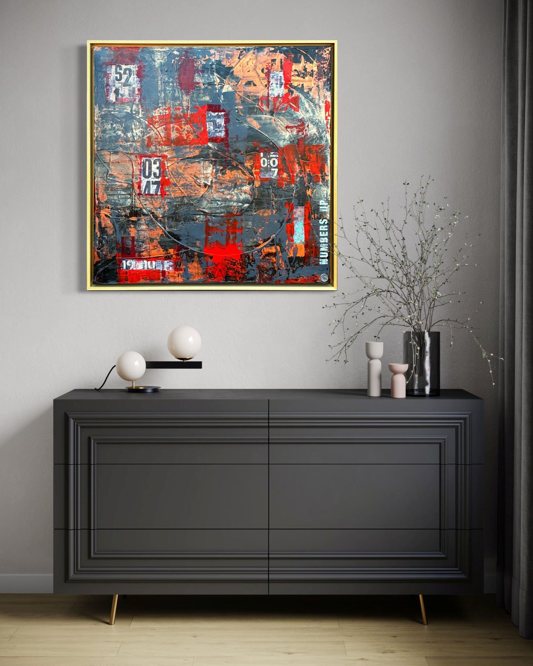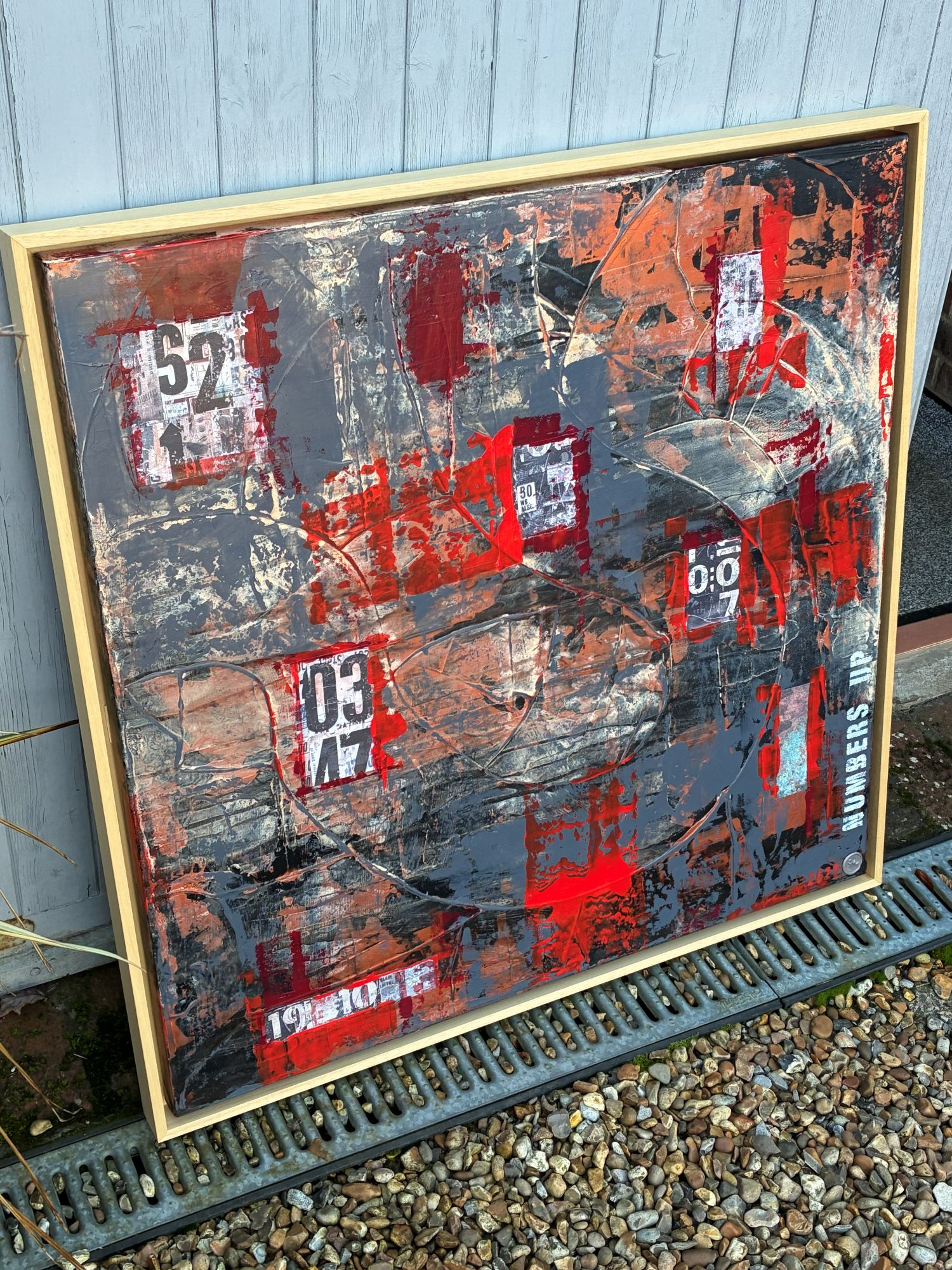 structure. Red, grey, and hints of black weave a mysterious numeric tale.