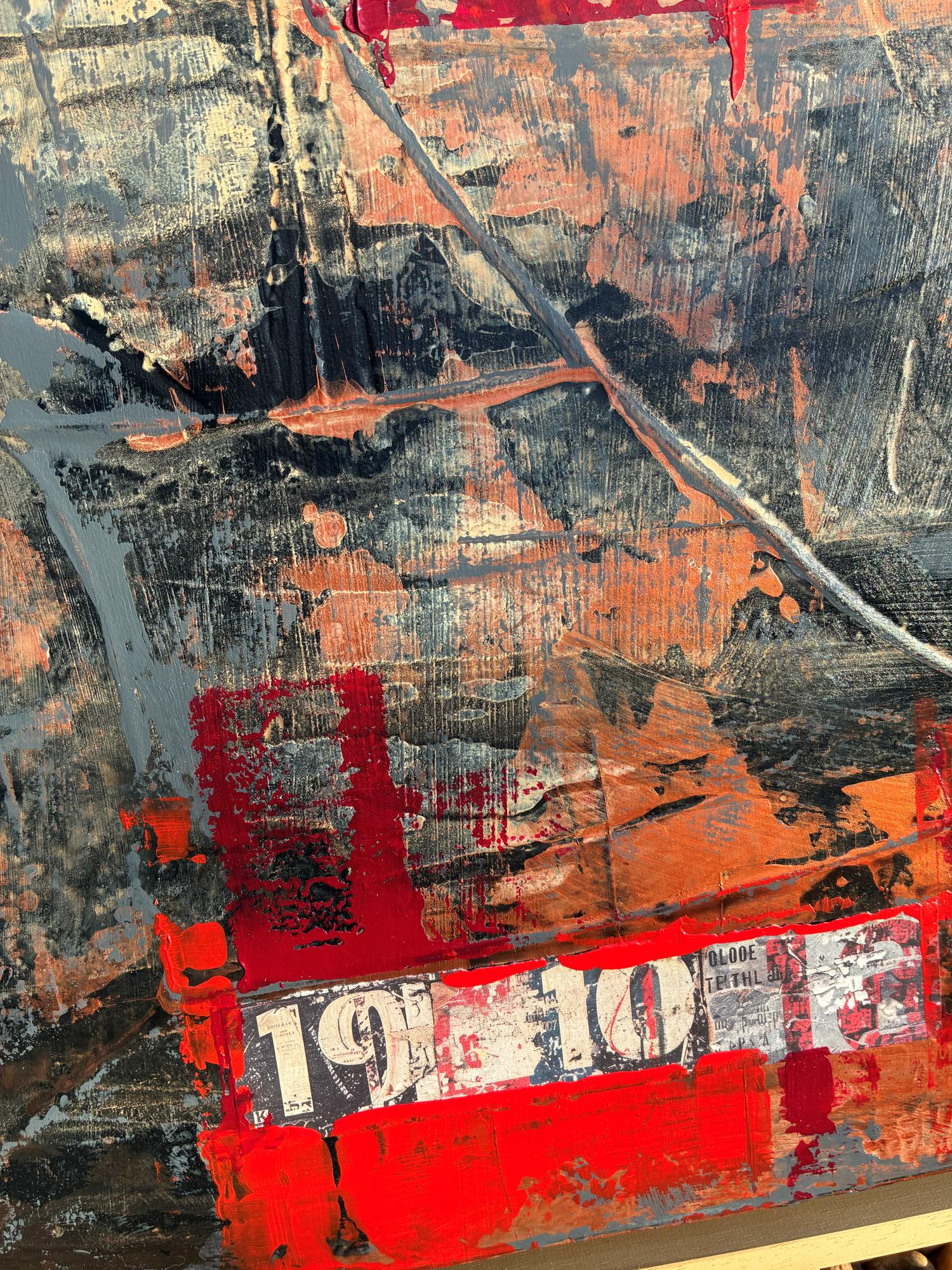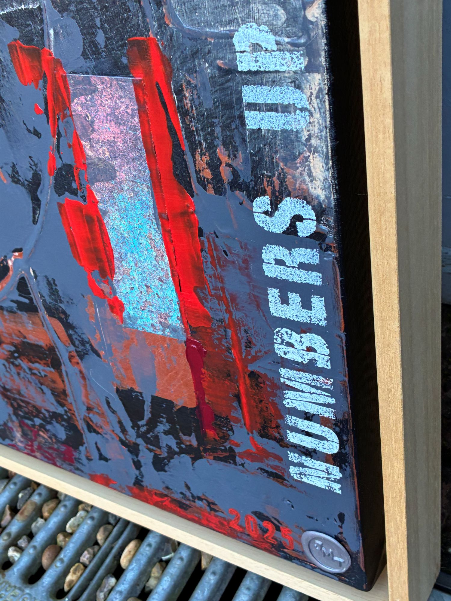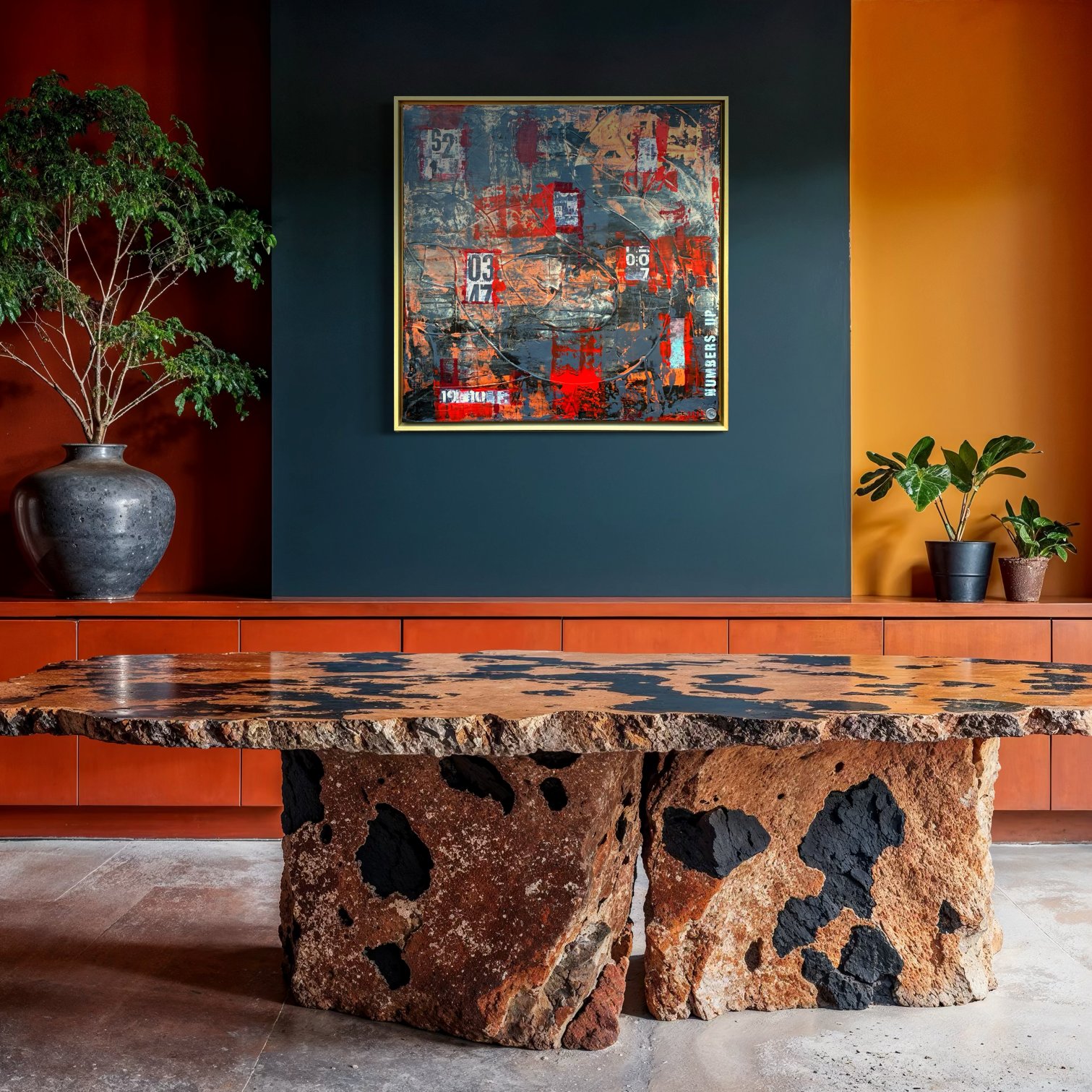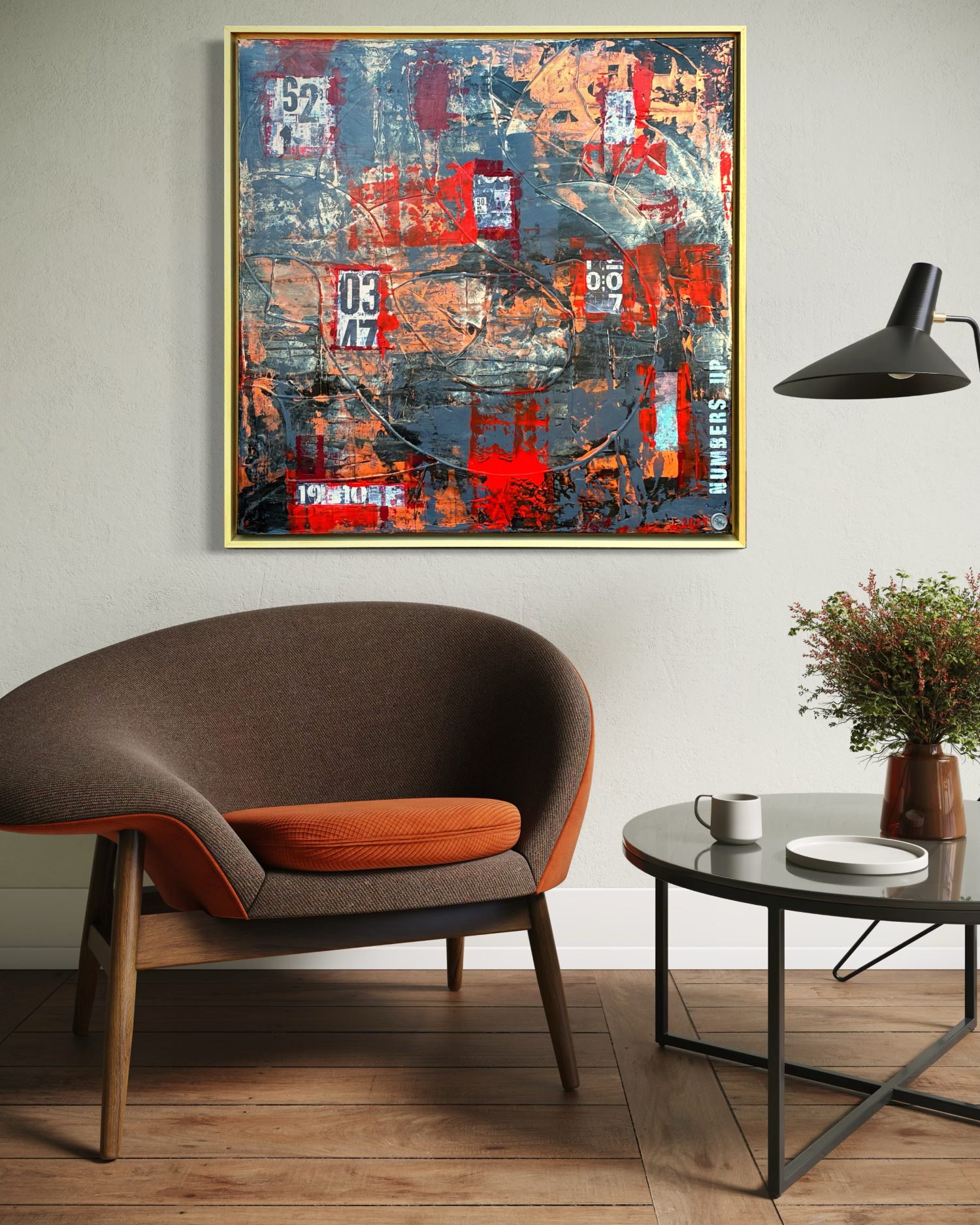 structure. Red, grey, and hints of black weave a mysterious numeric tale.