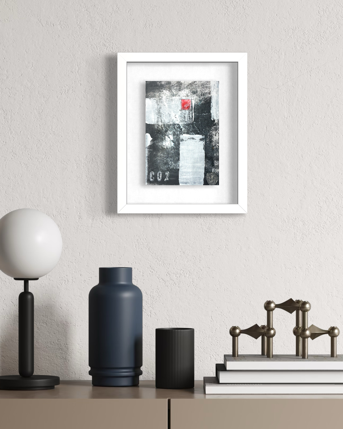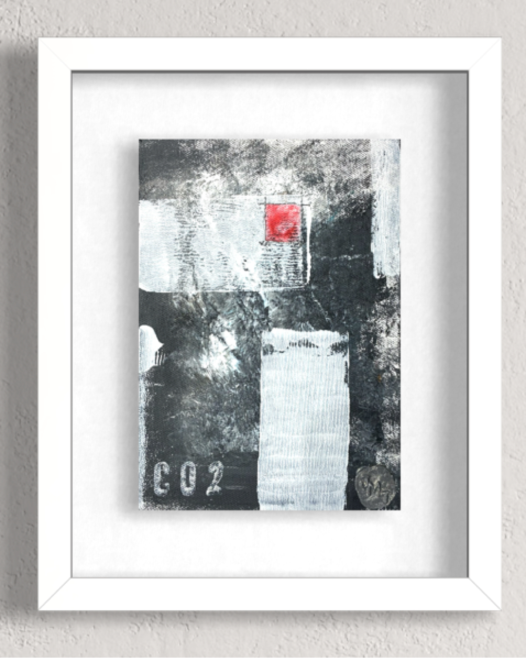 A striking abstract piece combining monochrome textures with a bold red square, evoking a sense of urban modernity