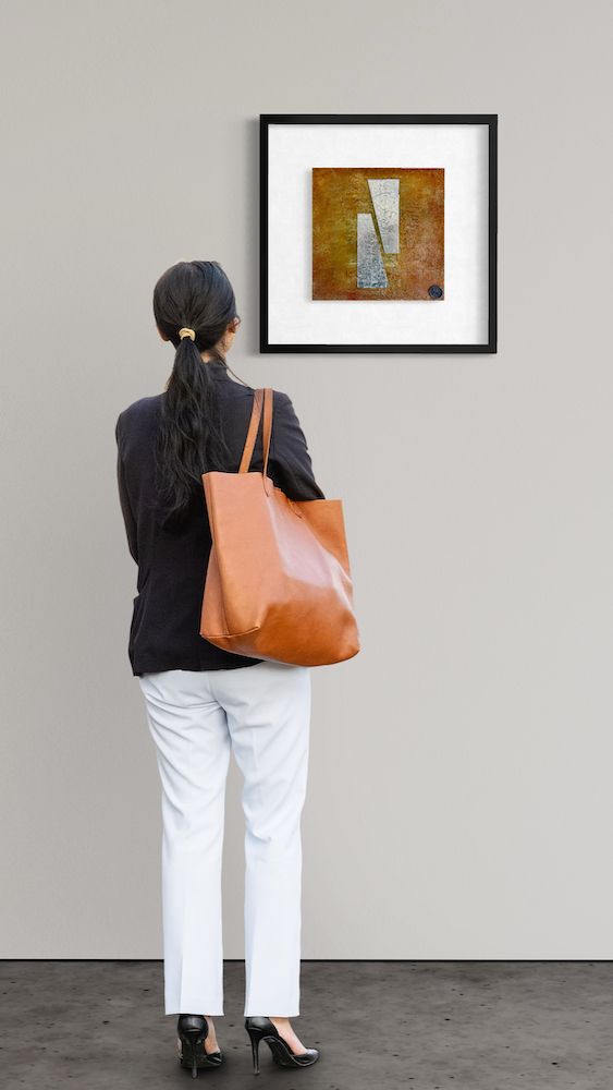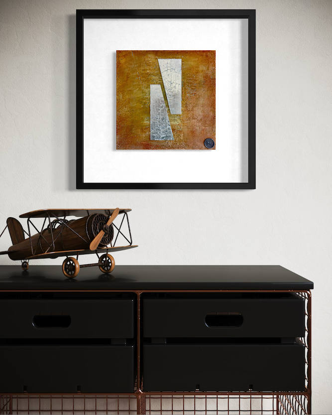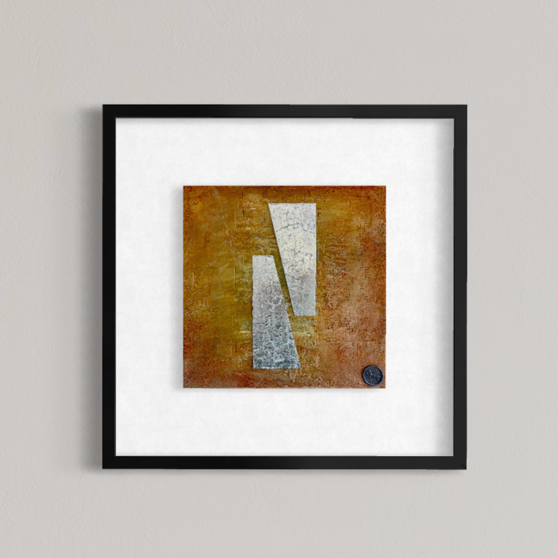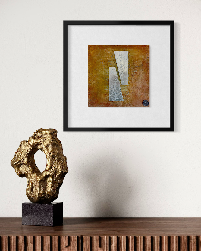 Set against this rugged backdrop are two metallic, silver forms. They’re irregular, tapering shapes—somewhere between geometric and organic—leaning slightly, as if in conversation or tension with each other. Their reflective, cracked surfaces contrast sharply with the matte, earthy background, making them feel like fragments or relics embedded into the piece. The vertical orientation of these forms gives a sense of structure, like abstract pillars or figures.