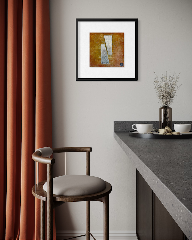 The background is a rich, weathered field of ochres, rusts, and burnt sienna—like oxidised metal or an aged wall that’s been exposed to time and elements. The surface is heavily textured, with layered marks, scratches, and impressions that give it a sense of history, almost like traces of something that once was. There’s a subtle gradient from lighter golden tones to deeper reddish hues, adding depth and warmth.