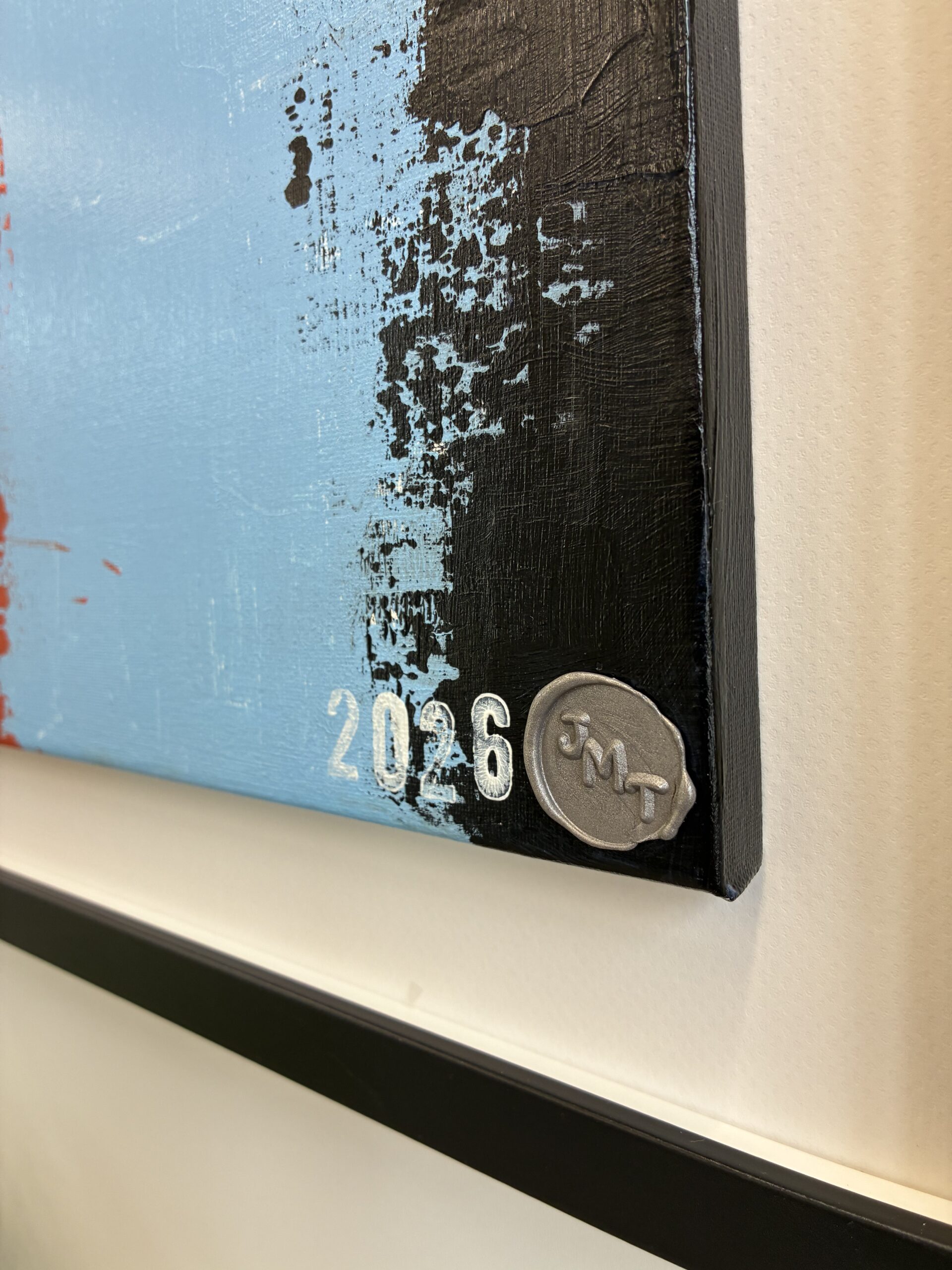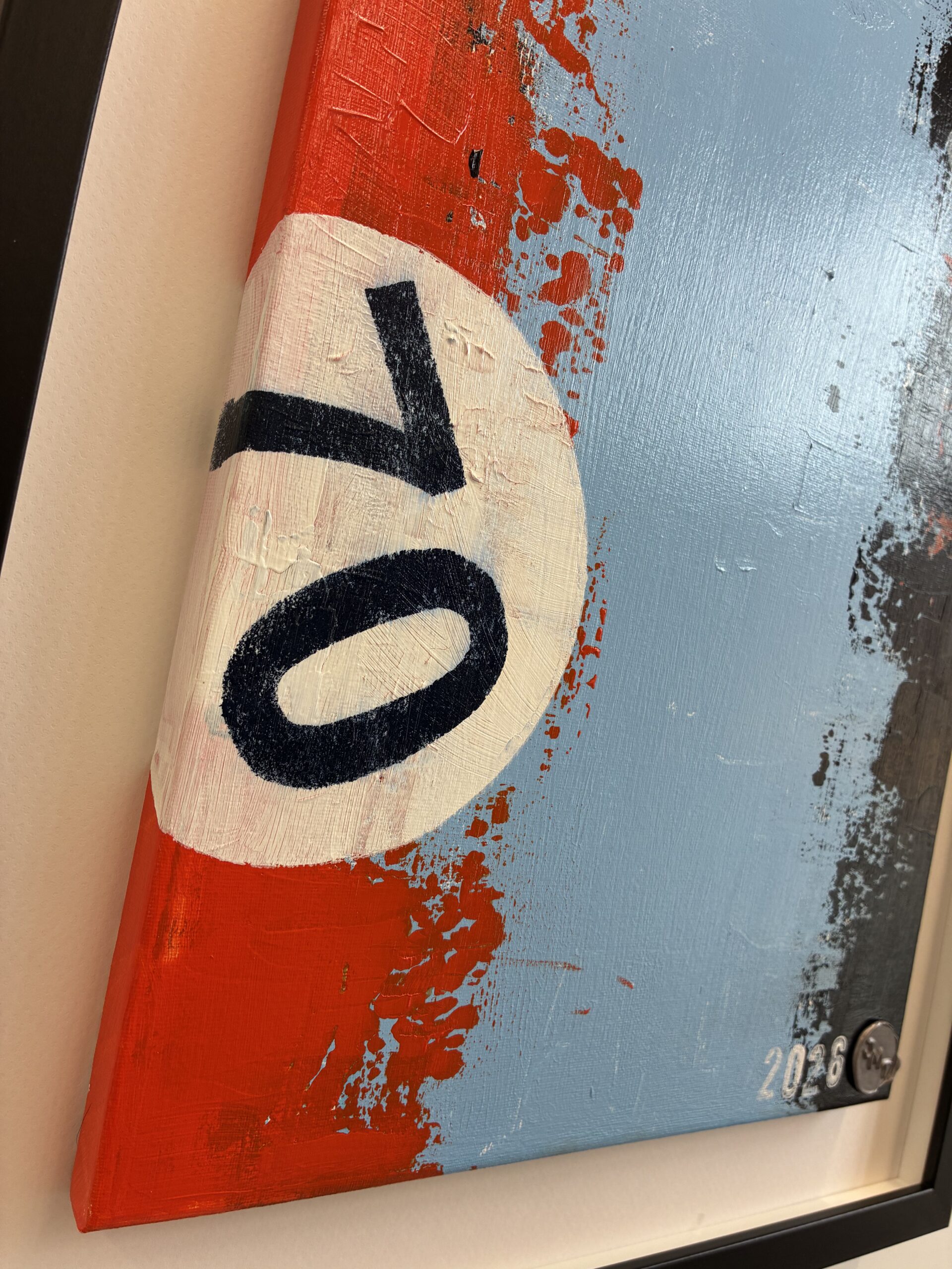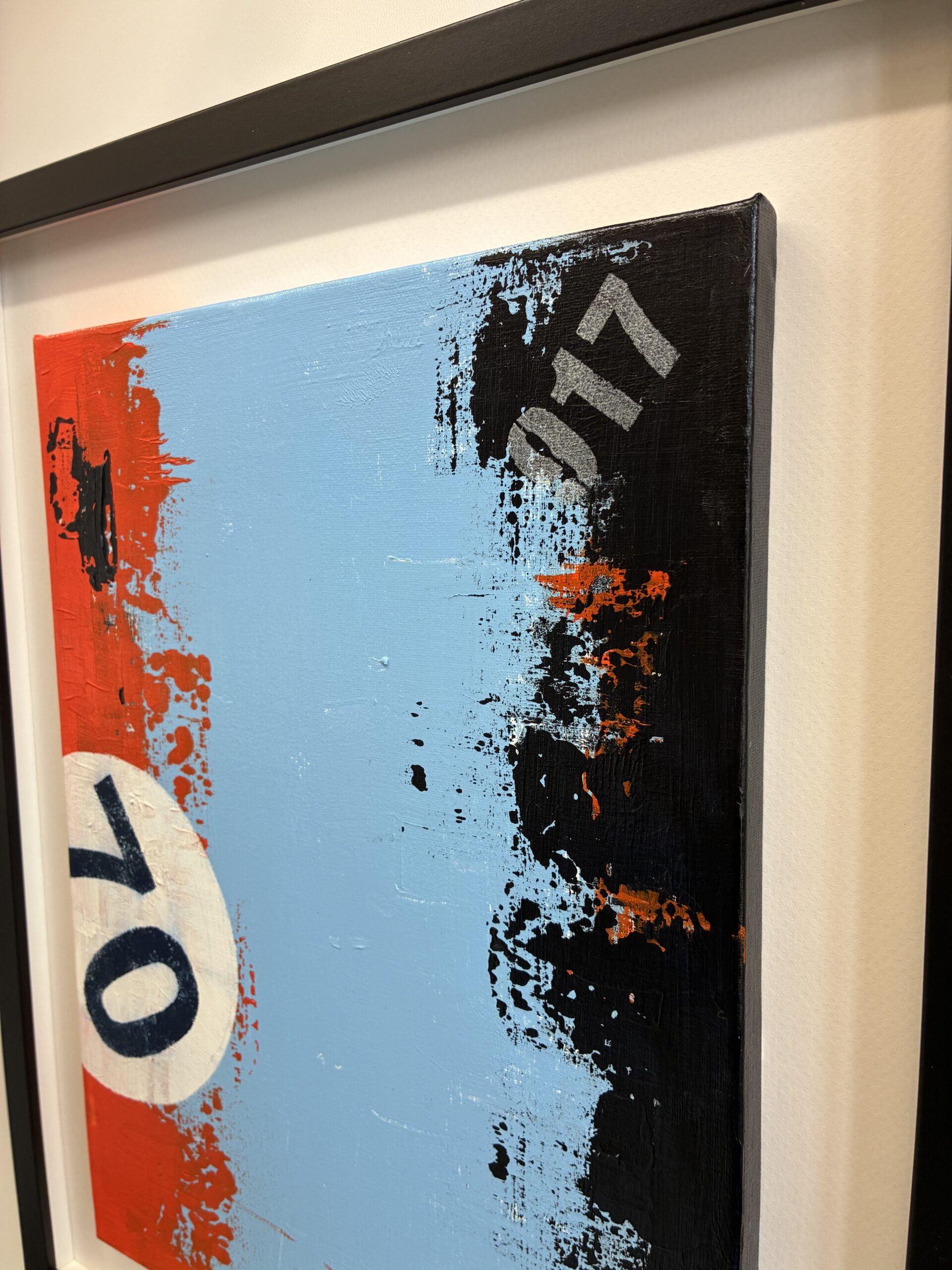 This piece is a tribute to the 1970 Porsche 917 Le Mans car in Gulf Oil livery. It presents bold, abstract colour fields—the pale Gulf blue centre with an orange left edge and a ragged black edge on the right—overlaid with a white racing-number circle, recalling the car’s graphic signage. The distressed, print-like texture reinforces a motorsport-inspired, graphic aesthetic. The canvas measures 40.0cm x 30.0cm with an overall frame size of 52.0cm x 42.0cm.