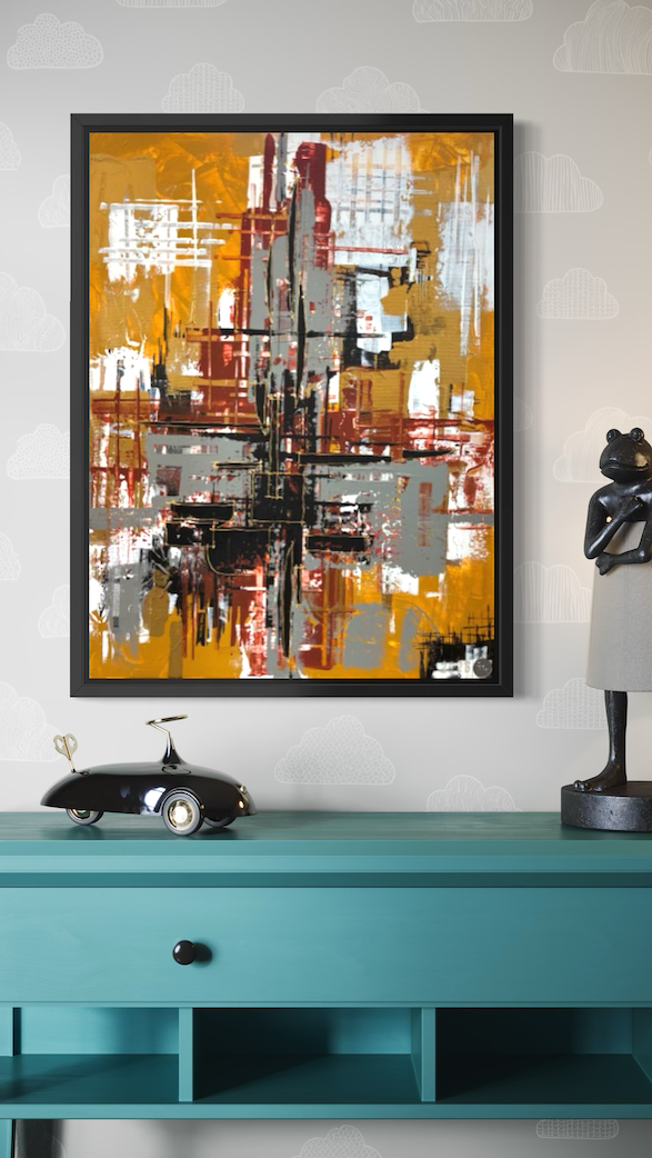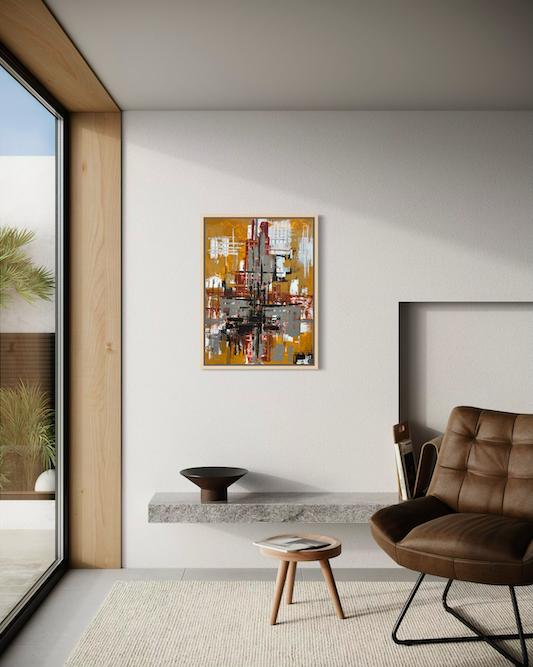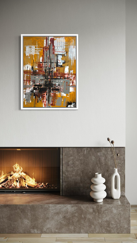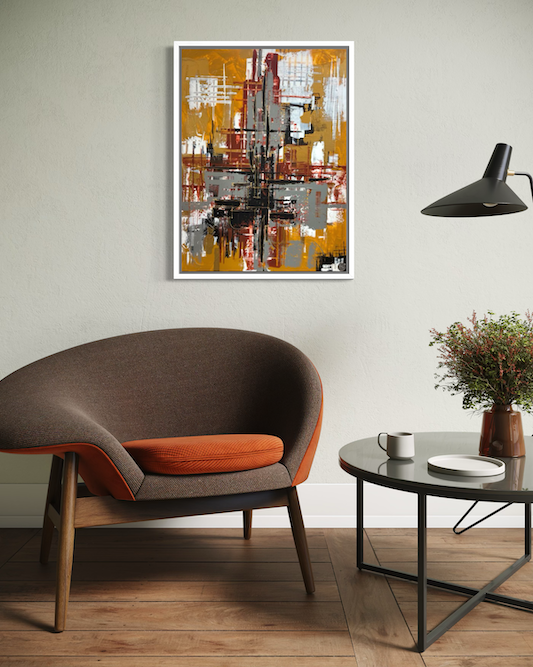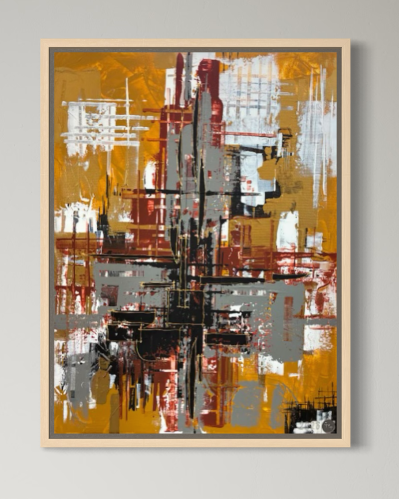 This abstract painting feels energetic and architectural, built from layered strokes and intersecting lines. A dominant cross-like structure anchors the composition, with bold contrasts between warm ochre/yellow tones and cooler greys, blacks, and whites. The textured application and drips give it a raw, expressive quality—like a cityscape deconstructed into motion and structure.