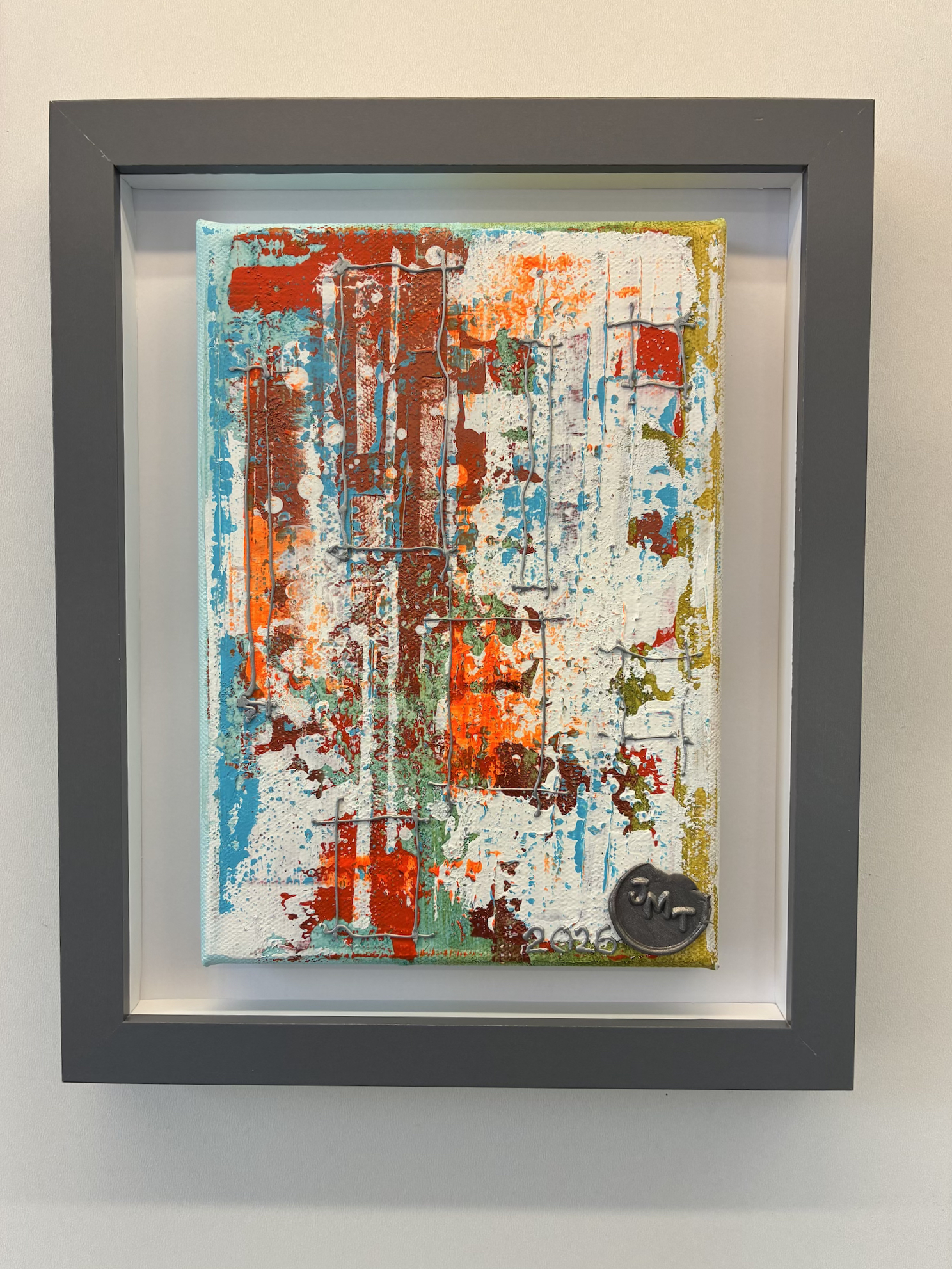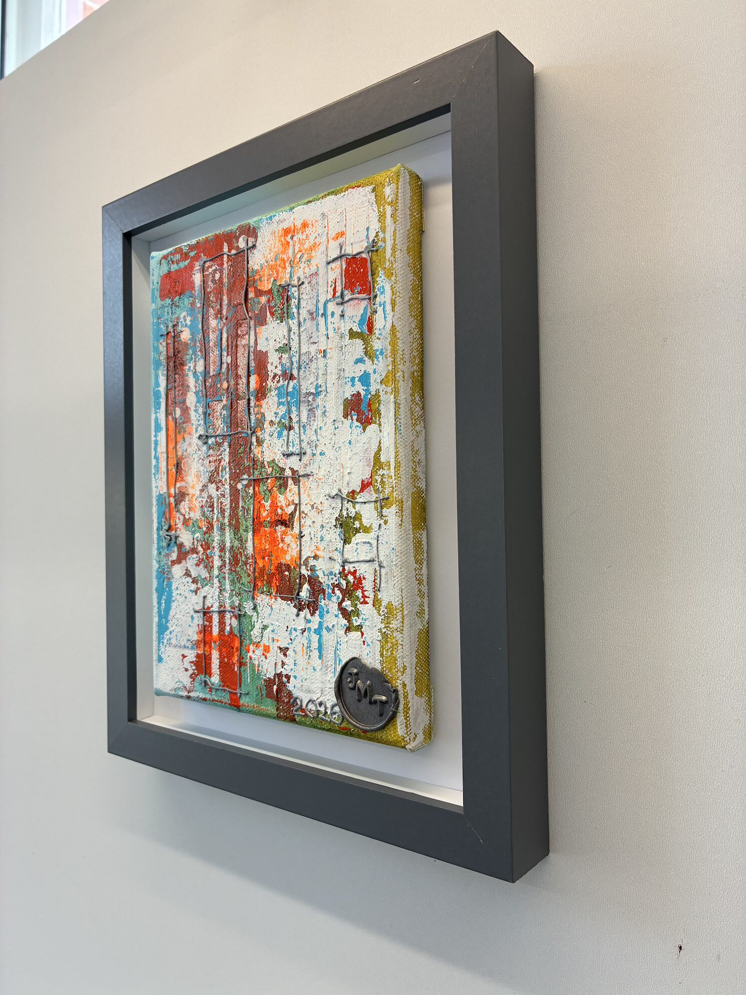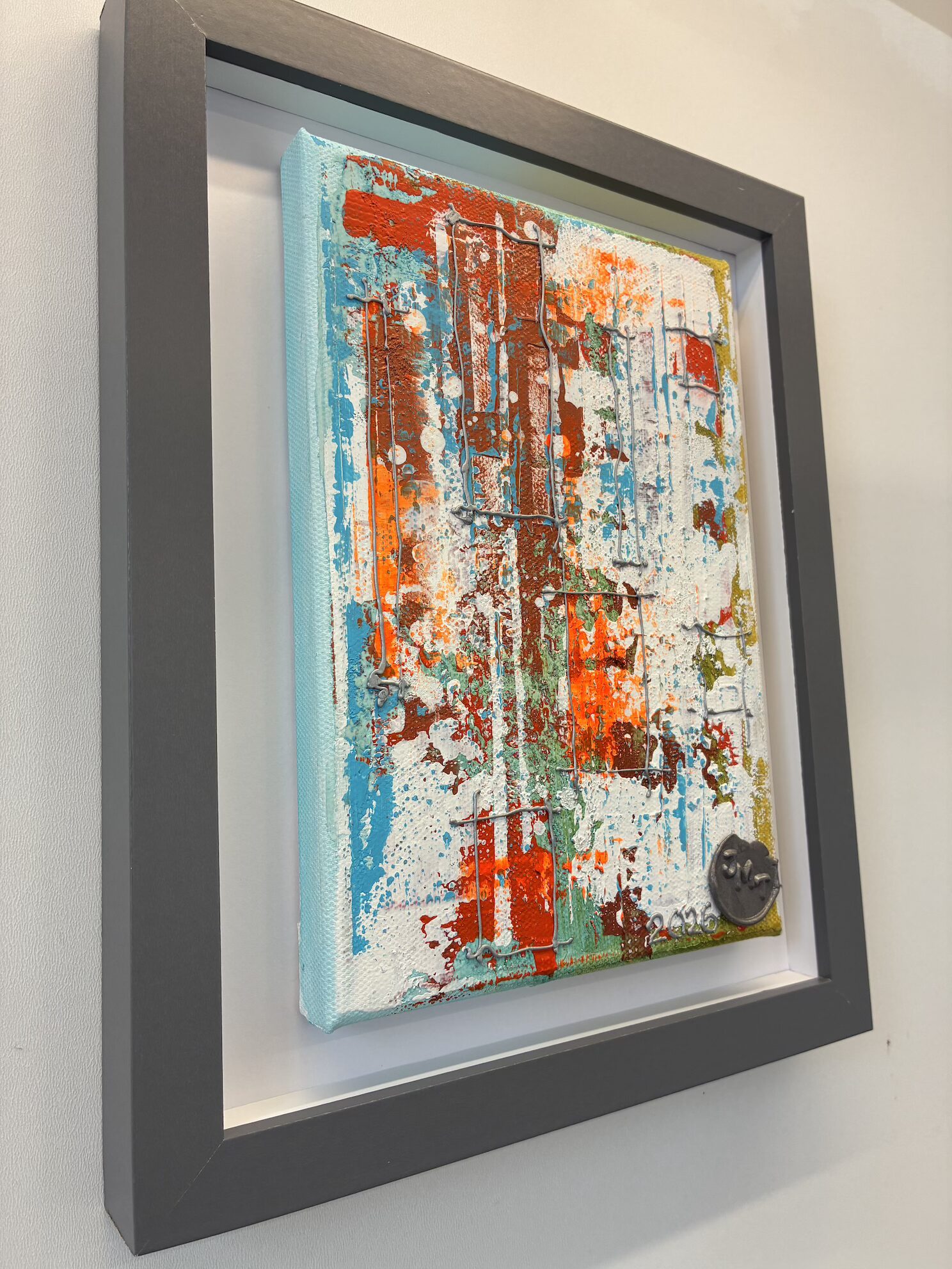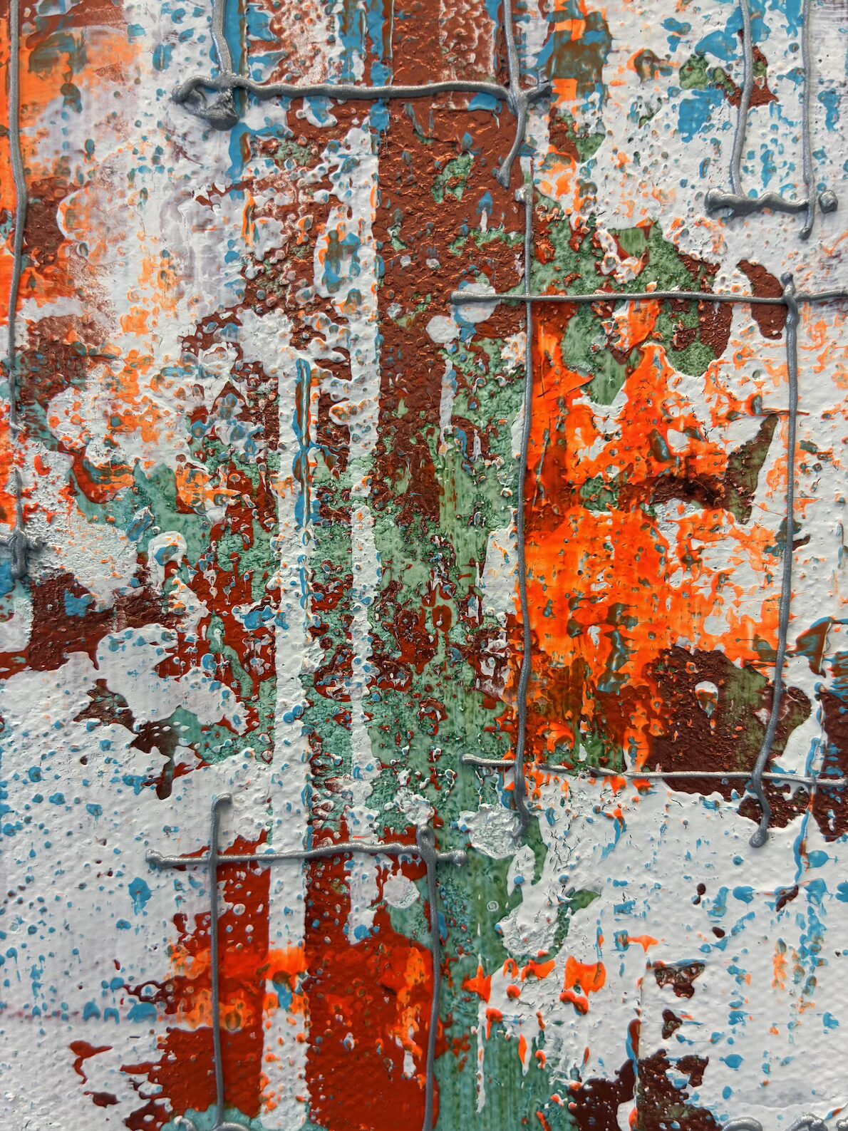This mixed-media abstract work explores the tension between structure and spontaneity through layered textures and dynamic colour interplay. A predominantly white ground is disrupted by vivid bursts of turquoise, vermilion, orange, and earthy tones, creating a sense of energy and movement across the surface. Dripped and splattered paint techniques introduce an element of controlled chaos, while raised linear forms suggest an underlying architectural grid—evoking fragments of an urban landscape or memory.