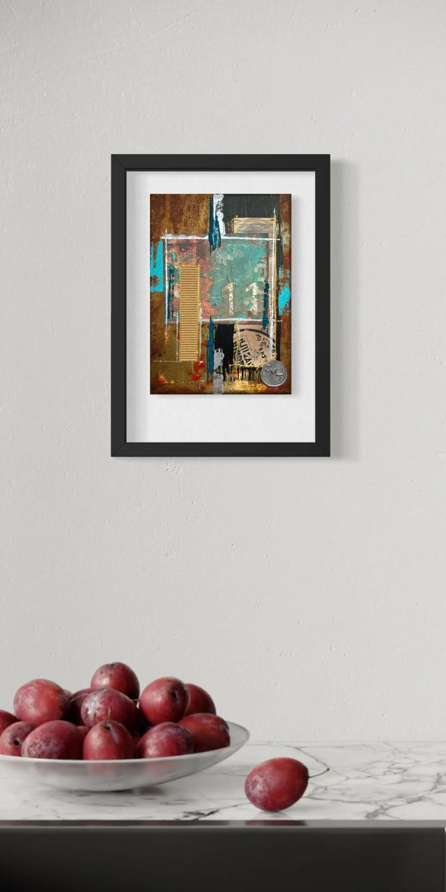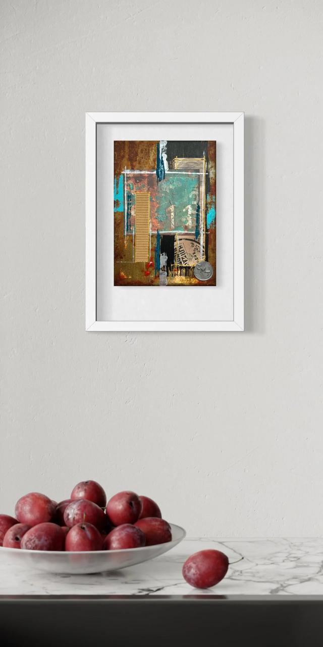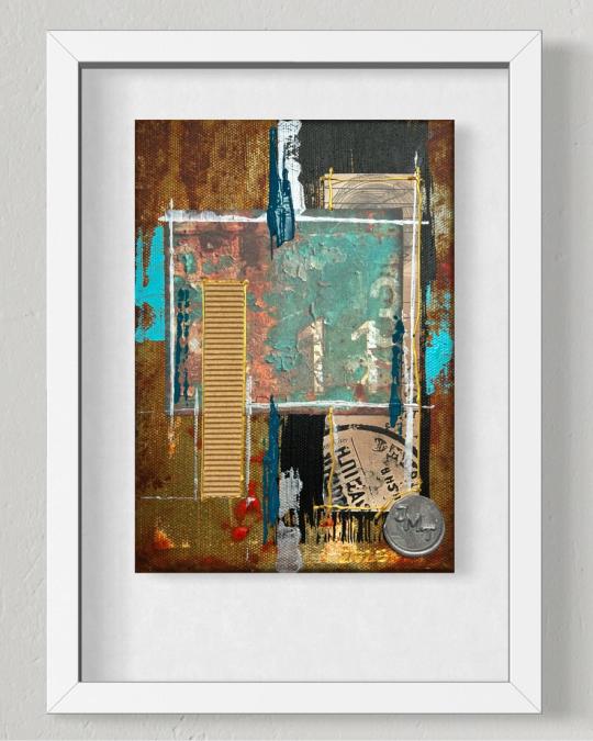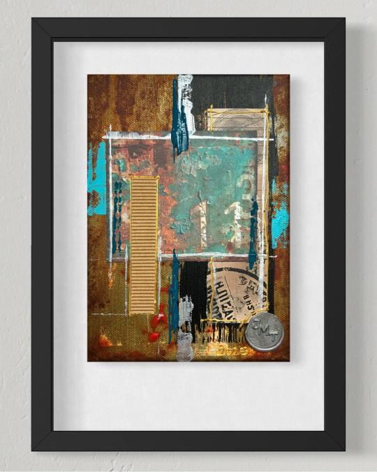 A collage of textures and colours evokes an industrial landscape. Metallic, earthy tones blend with vibrant hues to create dynamic depth. This artwork is on an A5 size Canvas 21.0cm x 14.8cm x 1.5cm deep. Framed in a simple frame on white mountboard. This Artwork can be framed in either black or white frame.