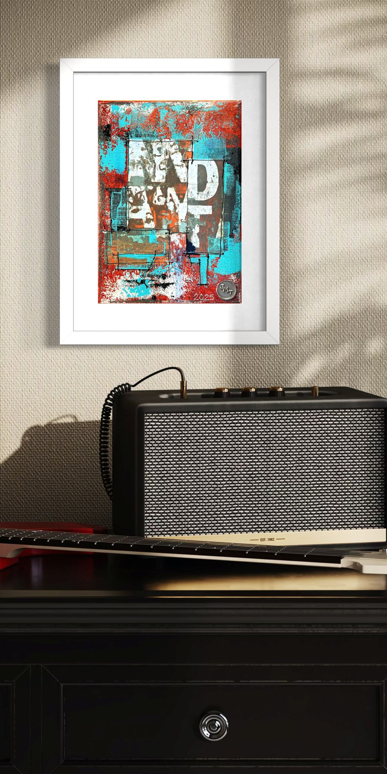 An edgy blend of colours and text, this piece vibrates with urban energy and