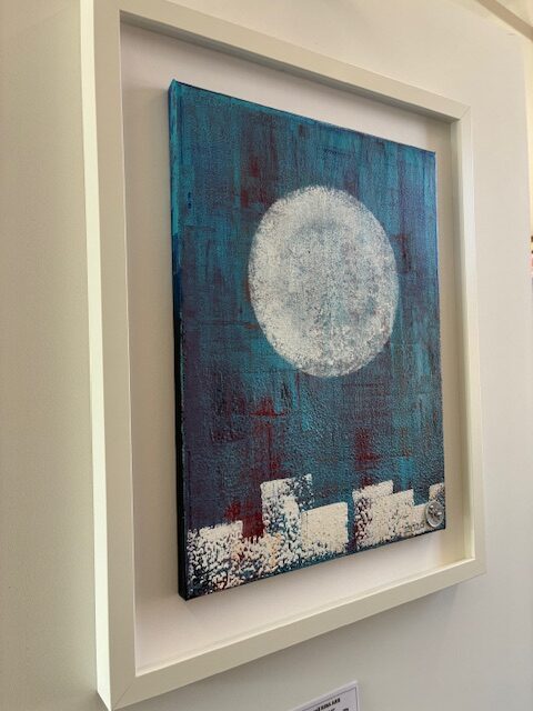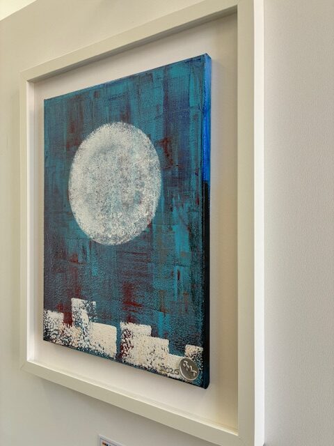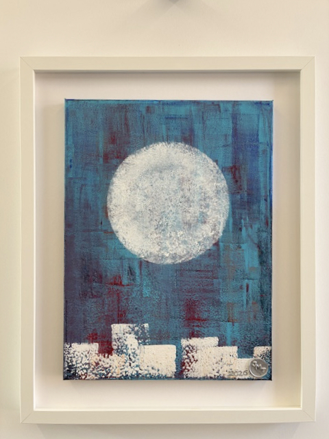 A serene moon hovers over textured geometric forms, blending the tranquillity of the night with abstract expression.